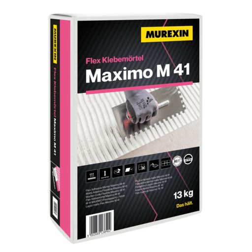 Flex Klebemörtel MAXIMO M 41 ist ein weißer, pulverförmiger, wasser- und frostfester, hoch vergüteter, hydraulisch mittelschnell abbindender flexibler Klebemörtel mit hoher Ergiebigkeit (+30%). Zum Verkleben von allen keramischen Materialien und verfärbungsunempfindlichen Natursteinen sowie zum Ausgleichen für Wand und Boden auf allen bauüblichen Untergründen im Innen- und Außenbereich in Schichtstärken von 2 bis 15 mm. Ausgezeichnete Wärmespeicherung und gutes Raumklima durch besondere Füllstoffe. Auch für Leichtbauweisen geeignet. Systemklebemörtel gemäß abP für die Verbundabdichtungen WD-1K, PU 500, 2 KS, PSM 1K, 1 KS, AE 100, Uniplatte. Siehe auch Kapitel Für ein perfektes System.Verwendungshinweise