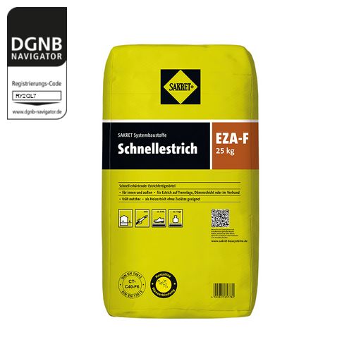 SAKRET Schnellestrichmörtel EZA-F ist ein hydraulisch schnell erhärtender Estrichfertigmörtel gemäß DIN EN 13813 CT-C40-F6 für die Herstellung schnell nutzbarer Böden. Er ist für die Anwendung innerhalb und außerhalb von Gebäuden geeignet.Verwendungshinweise
