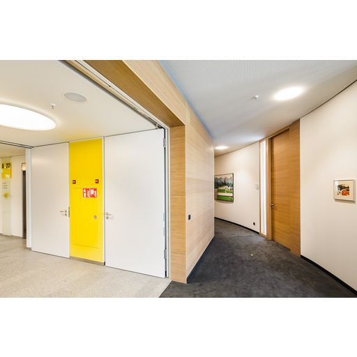 T30 Brand- und Rauchschutztür 50mm Basic (T 30/RS). Typ NHD 132, 232 / 122, 222. Das Platten-Volltürblatt kann wahlweise mit Lichtausschnitt oder Füllung ausgeführt werden. Dieses Türblatt erreicht einen Prüfwert (RwP) von 32, 37 oder 42 dB (Rw 27, 32 oder 37 dB) nach DIN 4109 und entspricht somit den Schallschutzklassen I, II oder III nach VDI. Die Konstruktion hat einen 5-fachen Türblattaufbau. Mit einerTürblattdicke von nur 50 mm sind Zargendurchgangsfalzmaße bis zu einer Höhe von ≤ 2483 mm möglich.