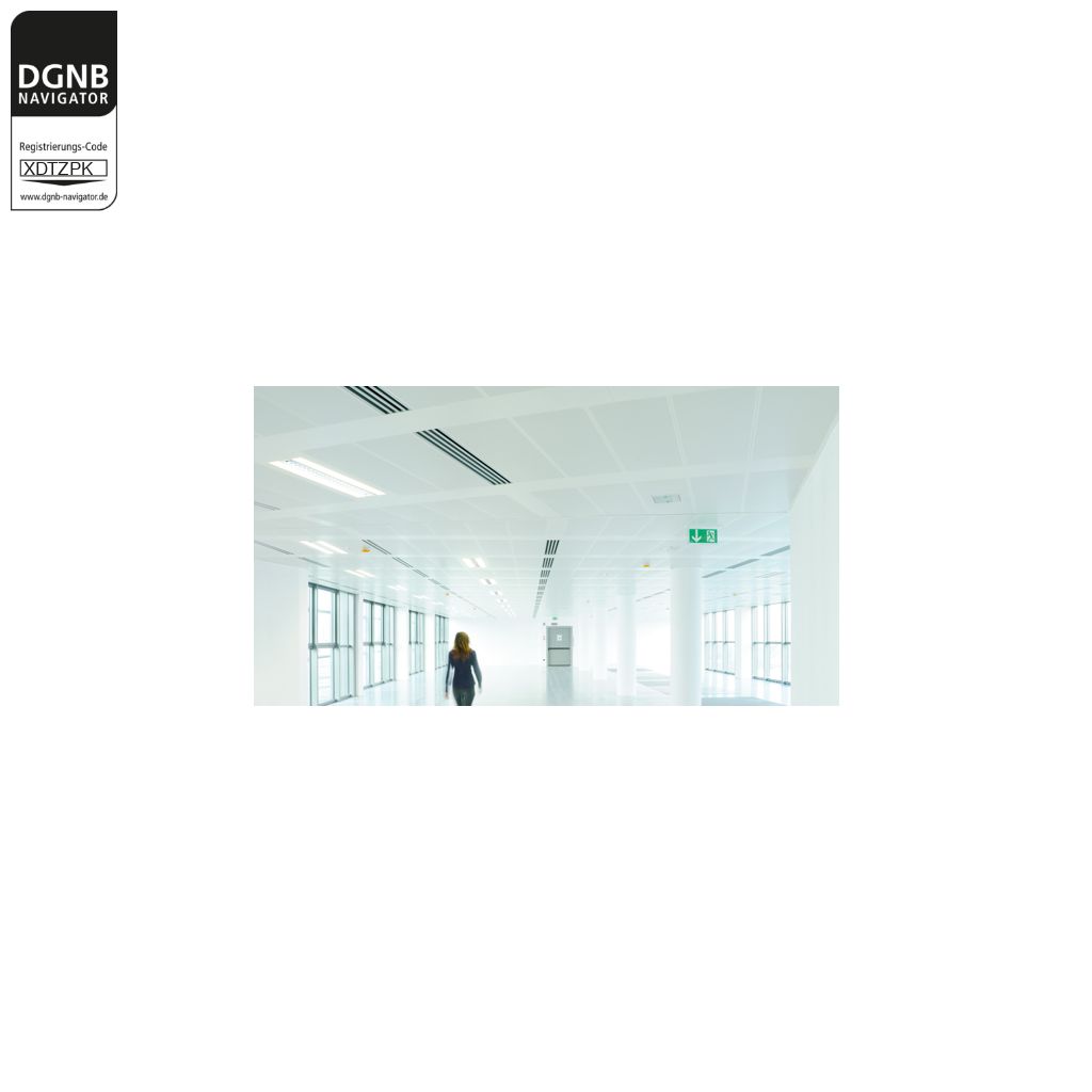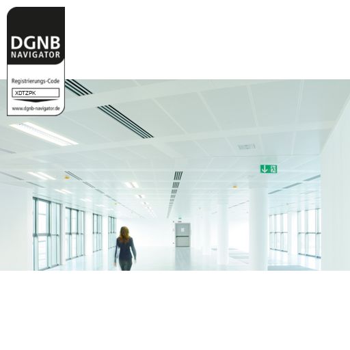 Abgehängte, akustisch wirksame Metallkassettendecke aus Langfeldkassetten. Kassetten und Unterkonstruktion bestehen aus verzinktem Stahlblech mit integriertem Akustikvlies und beschichteter Sichtseite.Bezug zum DGNB System