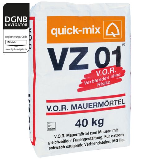 V.O.R. Mauermörtel für extrem schwach saugende Verblendsteine. Zum vollfugigen Mauern mit abschließendem Fugenglattstrich von schlagregensicherem Sicht- und Verblendmauerwerk. Druckfestigkeit > 5 N/mm².Bezug zum DGNB System