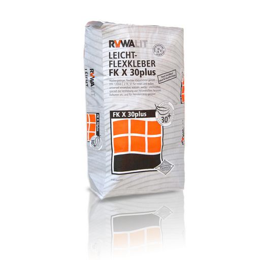Der Rywalit® FK X 30Plus Leicht-Flex-Fliesenkleber ist extrem leicht und geschmeidig zu verarbeiten. Der FK X 30Plus hat durch seinebesondere Leicht-Füllstoffkombination eine 30% höhere Flächenleistung als unser FK X Flex-Fliesenkleber. Der Rywalit® FK X 30Plus ist besonders standfest und kann variabel, als Dünnbett-, Fließbettkleber und als Mittelbettmörtel eingestellt werden. Er ist sehr gut geeignet zur Verklebung von großformatiger Keramik. Der Rywalit® FK X 30Plus eignet sich zum Verkleben von Wand- und Bodenplatten, insbesondere Feinsteinzeugfliesen, Mosaik und Glasmosaik, Spaltplatten und -riemchen, sowie verfärbungs- und verformungsunempfindliche Natur- und Kunststeinplatten.