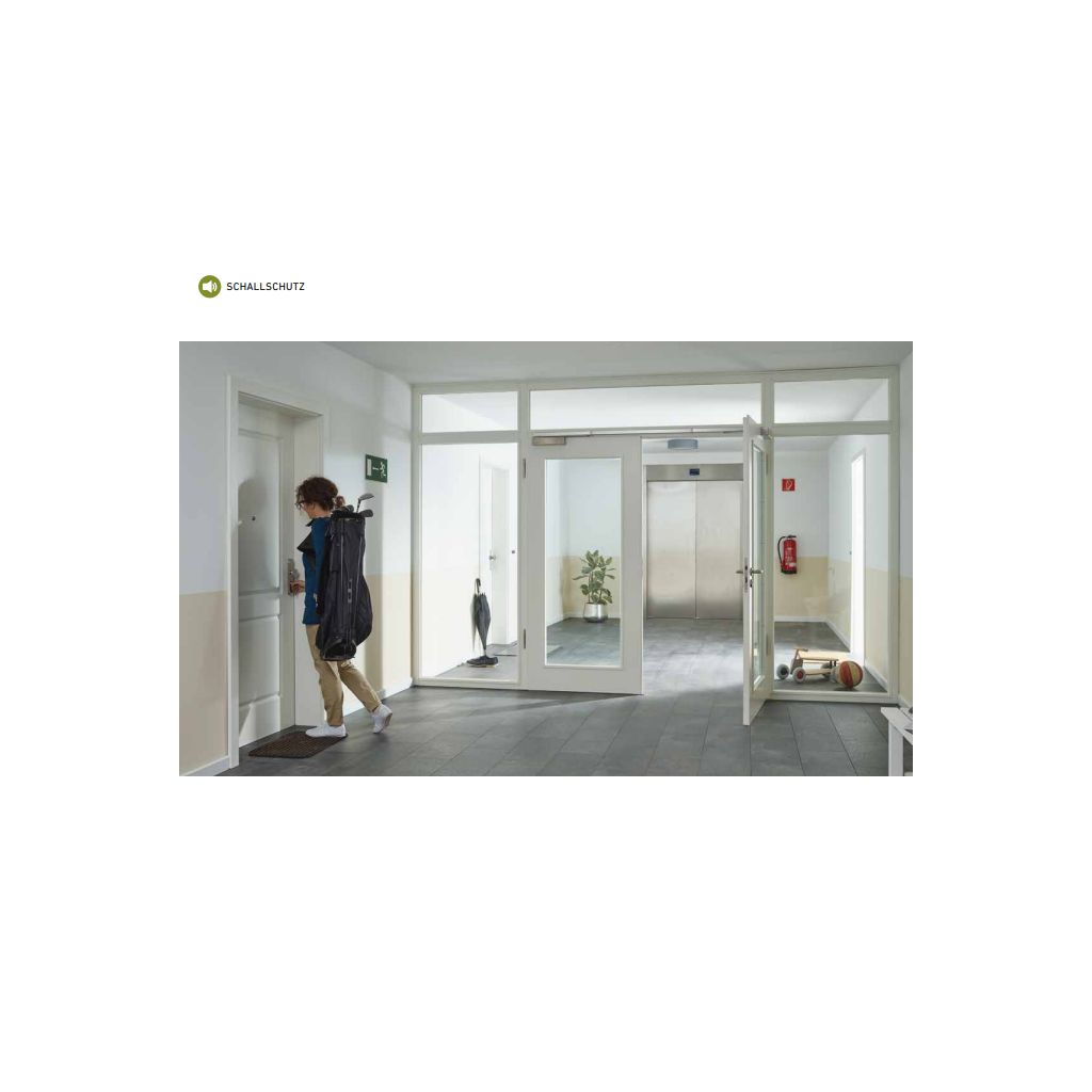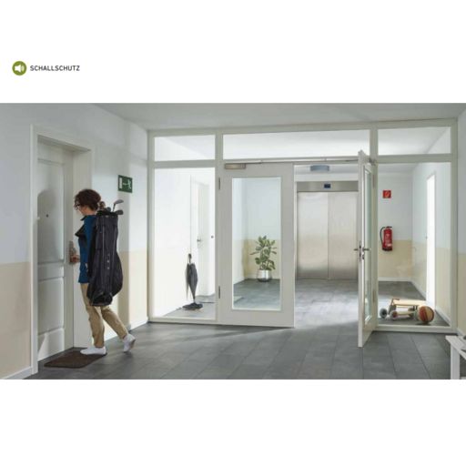 Empfehlung für erhöhten Schallschutz (Rw,R in dB): ≥ 37 (SK3) / Türen, die von Hausfluren oder Treppenräumen in geschlossene Flure und Dielen von Wohnungen und Wohnheimen oder von Arbeitsräumen führen / Türen zwischen Fluren und Übernachtungsräumen / Türen zwischen Fluren und Krankenräumen, Operations- bzw. Behandlungsräumen / Türen zwischen Unterrichtsräumen oder ähnlichen Räumen und FlurenBezug zum DGNB System
