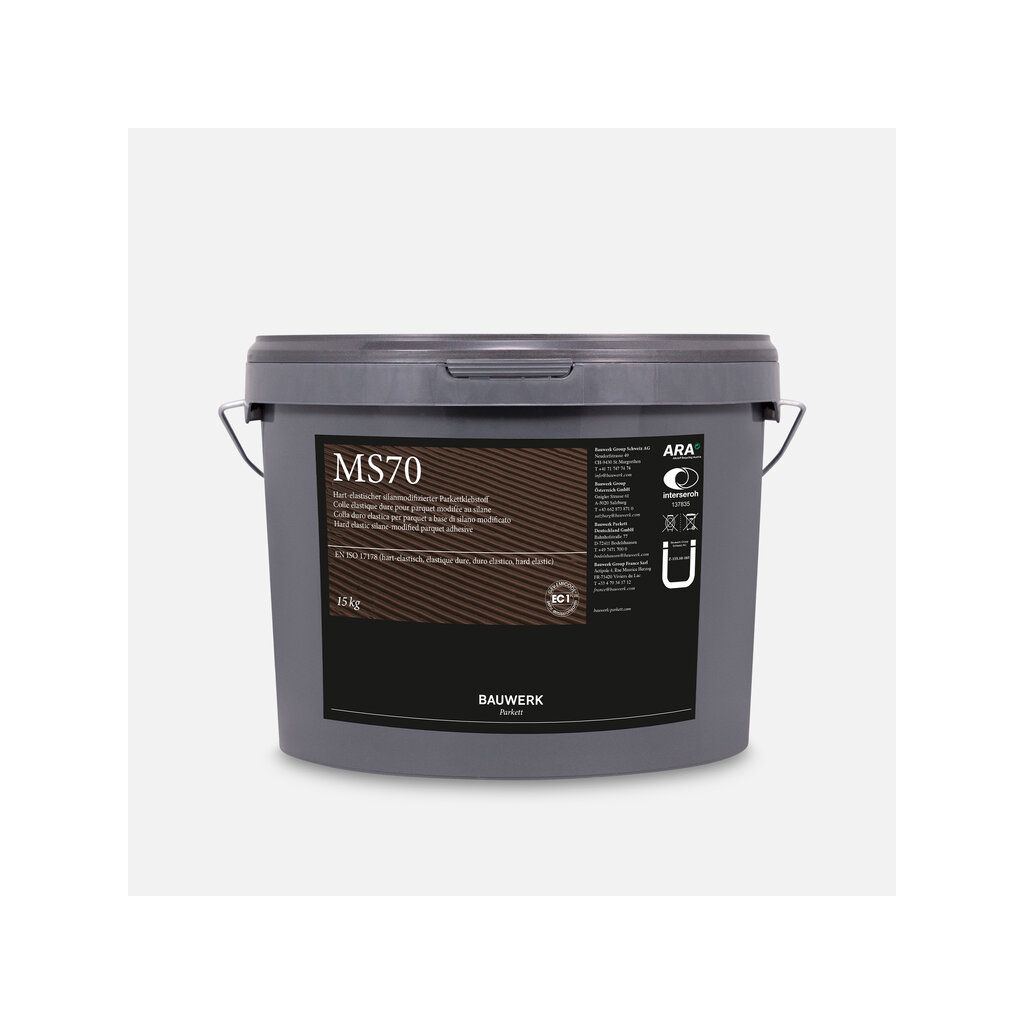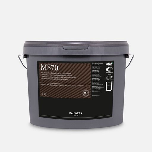 MS70 ist als wasser- und lösungsmittelfreier silanmodifizierter Klebstoff für die Verklebung von Bauwerk Parkett auf geeigneten und belegereifen Untergründen wie u.a. Calciumsulfat- oder Zementestrichen oder Verlegeplatten aus Holzwerkstoffen oder auf Calciumsulfatbasis geeignet. Universeller und leistungsstarker Klebstoff für die Verklebung auf schwierigen Untergründen und besonders großformatiger Parkettelemente. Ausgestattet mit der revolutionären Titanium Crosslinking Technologie zeigt der Klebstoff ein schnelles Abbinden mit sehr hoher Anfangshaftung. Die hart-elastische (nach ISO 17178) Einstellung mit verbesserter Scherfestigkeit garantiert ein perfektes Ergebnis über die Lebensdauer des Bodens. Die einfache Handhabung, der gute Riefenstand sowie das geringe Emissionsprofil machen MS70 zu einem Premium-Parkettklebstoff für die tägliche Anwendung.Dokumente