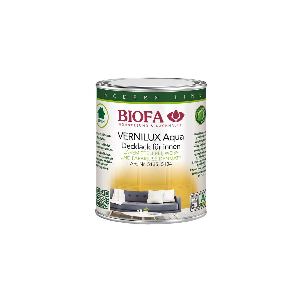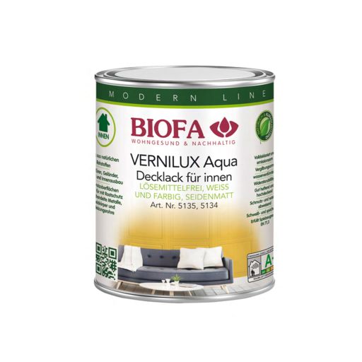 BIOFA VERNILUX Aqua Decklack seidenmatt ist ein auf Wasserbasis hergestellter natürlicher Öllack, lösemittelfrei, seidenglänzend, wasserverdünnbar und für alle Holzoberflächen im Innenbereich wie z. B. Fenster, Türen, Innenausbau, Geländer, Möbelaußenflächen, Kinderspielzeug etc. geeignet. Er hat eine sehr gute Haftung, ein hohes Deckvermögen und ist extrem vergilbungsarm. Wegen der leichten Verarbeitung und der schnellen Trocknung macht das Streichen mit diesem Lack Spaß. Nach einer entsprechenden Vorbehandlung mit Rostschutz eignet sich der widerstandsfähige Naturlack auch für Metalluntergründe, Heizkörper und Heizungsrohre.
