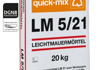 quick-mix LM 5/21 ist ein mineralischer Leichtmauermörtel mit Blähton zum Vermauern von hochwärmedämmenden Eigenschaften mit einer Druckfestigkeit von 5 N/mm². Das kg CO2-Äquivalent pro m² ist durch seine hohe Ergiebigkeit im Gegensatz zu…