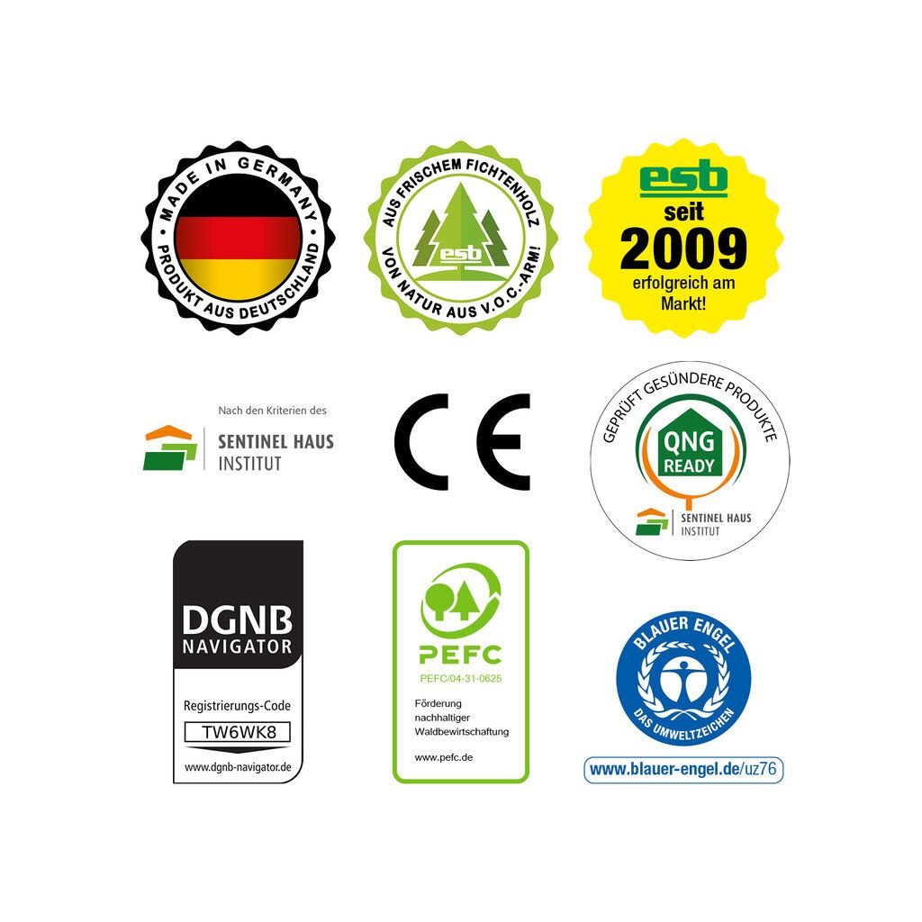 Geringe Formaldehyd-Emissionen, Formaldehyd-Gehalt von ≤ 0,03 ppm. Speziell für den zertifizierten, konstruktiven Holzbau und Fertighausbau geeignet. Blauer Engel und Sentinel Holding Institut zertifiziert.