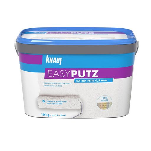 Knauf EASYPUTZ ist ein gebrauchsfertiger Dekorputz, den Sie ganz einfach mit einer Rolle auftragen können. Dank 50 % Marmoranteil sorgt der schneeweiße, matte Oberputz zudem für beeindruckende Akzente in der Wohnraumgestaltung und lässt sich mit Knauf Compact Colors einfach durchfärben.Dokumente