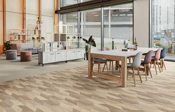 Heterogener lose liegender und wiederverwenbarer PVC-Bodenbelag in Fliesen und Planken. Einsatz zum Beispiel im Retail-Bereich, in Hotels oder Büro- und Verwaltungsgebäuden.