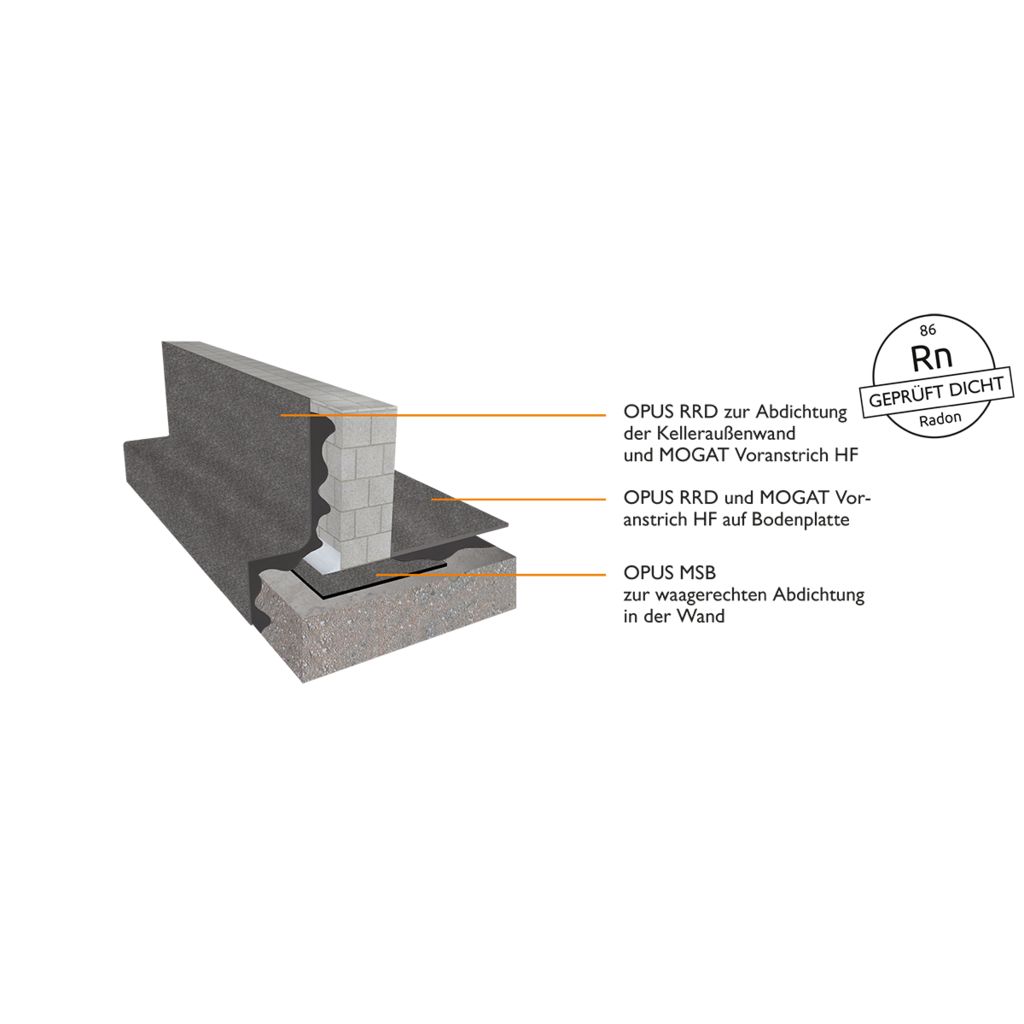 OPUS RRD ist eine hochwertige Elastomerbitumen-Schweißbahn, die sich ideal zum Schutz gegen Radon eignet. Zudem kann die Bahn als außenliegende streifenförmige Abdichtung von Arbeitsfugen und Sollrissquerschnitten in Bauteilen aus Beton, mit hohem Wassereindringwiderstand gegen drückendes und nicht drückendes Wasser sowie gegen Bodenfeuchte eingesetzt werden.Verwendungshinweise