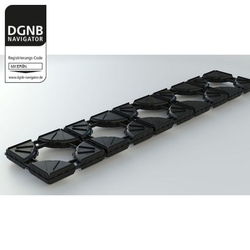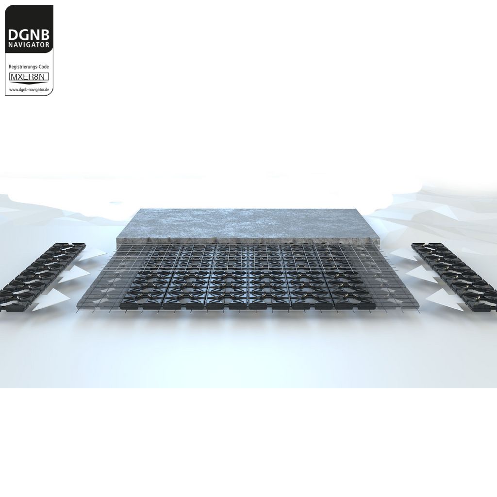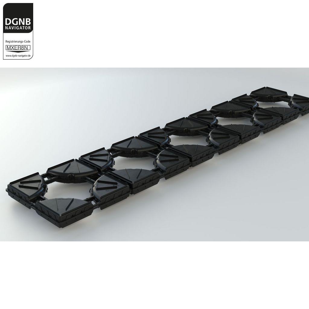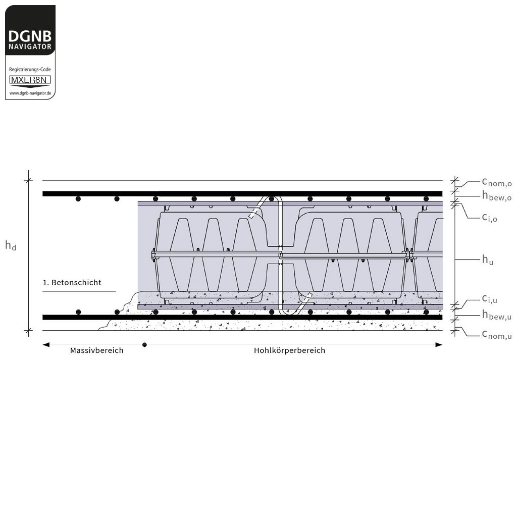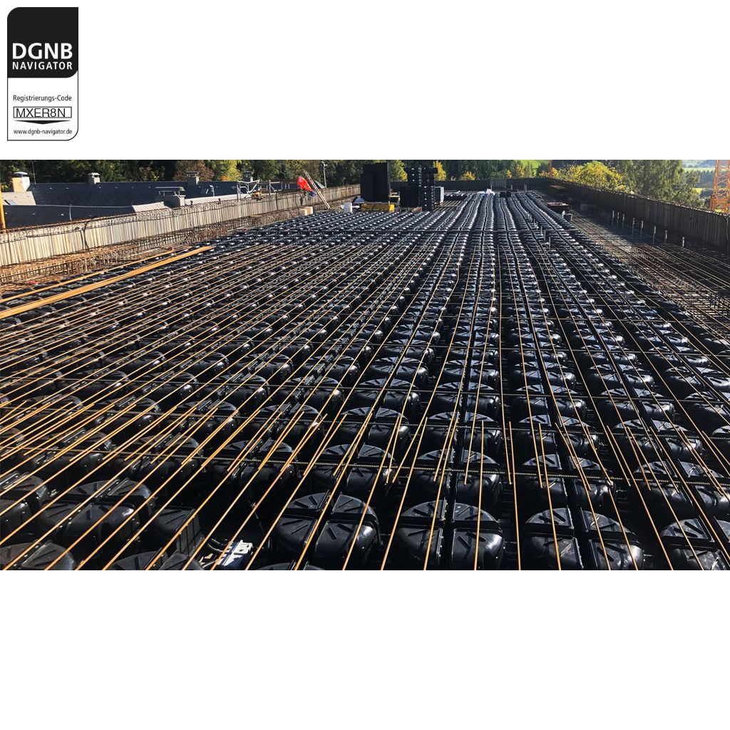 Verdrängungskörpersystem für Betondeckensysteme, bestehend aus 250 cm langen linearen Unterstützungskörben aus Bewehrungsbaustahl mit integrierten Hohlkörpern aus rezykliertem Polyethylen.