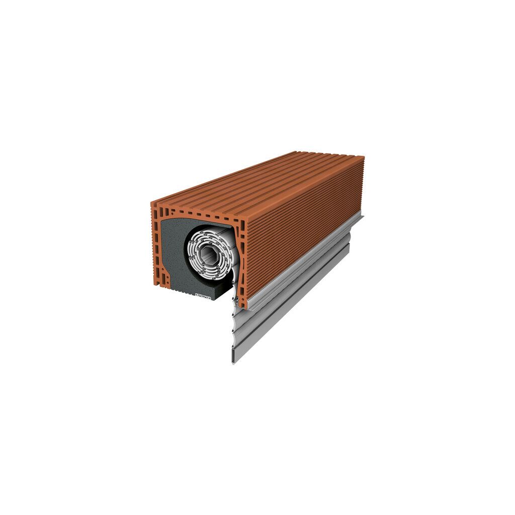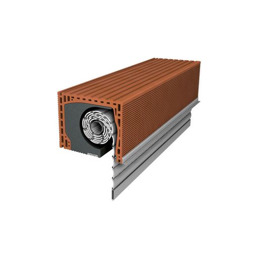 Ziegelrollladenkasten, selbsttragend, aus plangeschliffenen Ziegel-Formteilen. Wärmedämmung aus Neopor® mit Lambda 0,032W/mK, Kasten-Abschlussschiene 20mm Überstand sowie wärmegedämmten Seitenteilen.Bestehend aus: