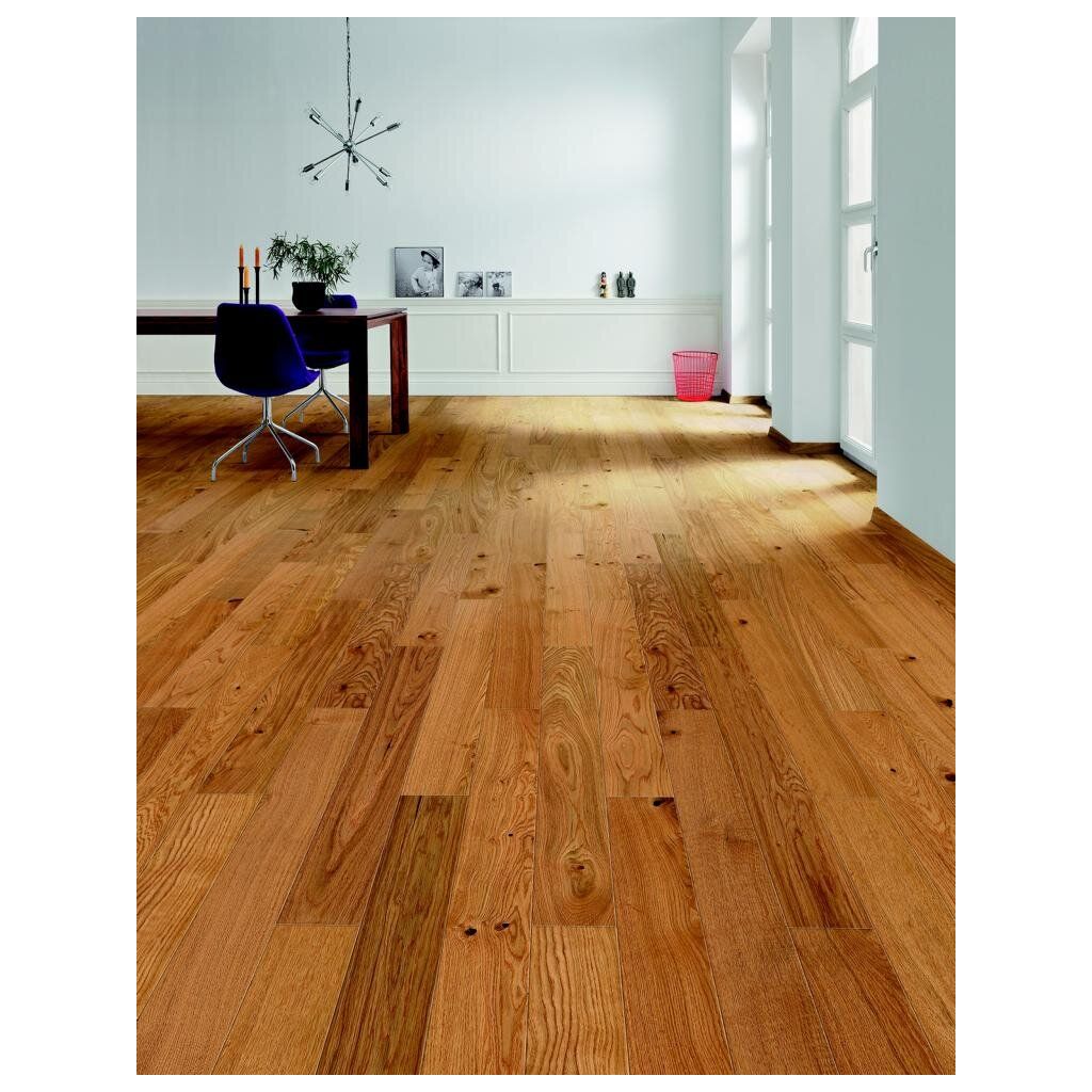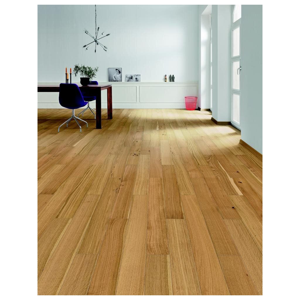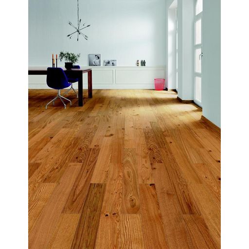 Dreischichtaufbau mit ca. 2,5mm Edelholznutzschicht, HDF-E1 Trägerplatte und Gegenzugfurnier aus Nadelholz.Das Fertigparkett Living by Haro Toskana besticht durch sein kleines, handliches Dielenformat. Ein qualitativ hochwertiger Markenboden für die einfache, schwimmende Verlegung in Wohnräumen mit einem sehr guten Preis-/Leistungsverhältnis. Die einzigartige Holzoptik fügt sich in jedes Ambiente ein und sorgt für einen tollen modernen Auftritt.