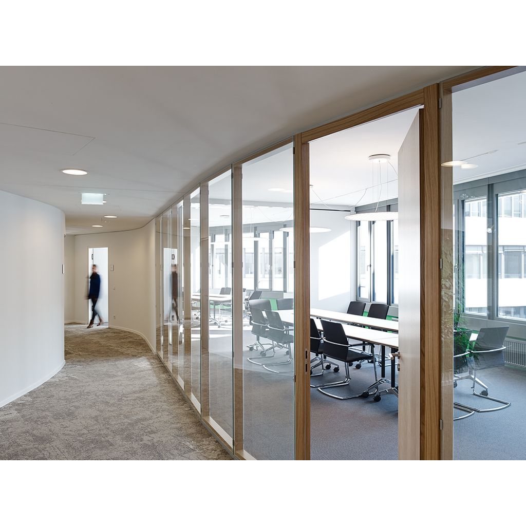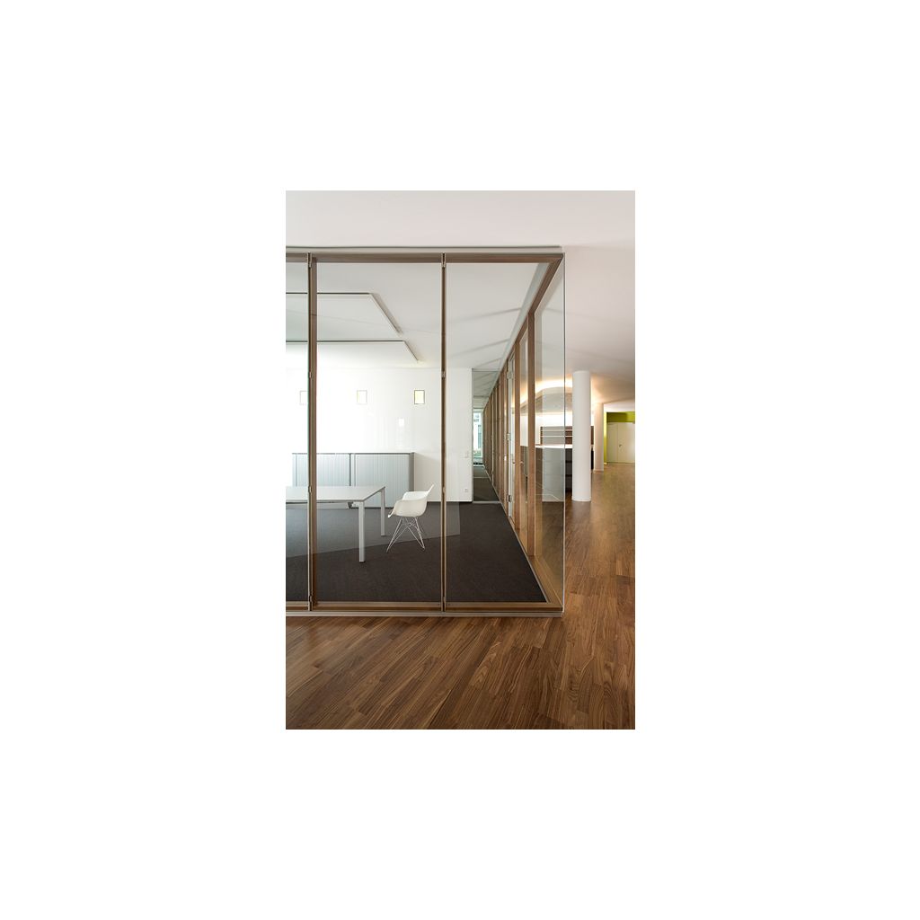 Das System T in Holzpfosten-Riegelbauweise wirkt durch den Kontrast zwischen den Holzoberflächen und der flächenbündigen Verglasung sehr hochwertig und elegant. Dieser Eindruck wird durch die filigrane Ansichtsbreite der Pfosten von nur 35 mm unterstrichen und sorgt so für ein besonders klares und minimalistische Design. Die Holzpfosten-Riegelbauweise ist im Systemtrennwandbereich einmalig. Als CO2-neutrales Konstruktionsmaterial betont Holz sichtbar eine nachhaltige Architektur.Das Trennwandsystem T ist auch als freistehender Holz-Glas-Kubus realisierbar.