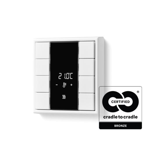 Durch intelligente Technik und die Verwendung kreislauffähiger Materialien tragen JUNG Produkte zur Gebäudeenergieeffizienz und Reduktion von CO2-Emissionen bei. Mit smarten Lösungen zur Gebäudesteuerung wie JUNG KNX können Energieverbräuche gemessen, analysiert und reduziert werden. Langlebigkeit, zeitloses Design, höchste Materialqualität und absolute Benutzerfreundlichkeit – das Zusammenspiel dieser Merkmale ermöglicht eine jahrzehntelange Nutzung der Produkte. Mit der Cradle-to-Cradle-Zertifizierung seiner meistgenutzten Einsätze und Schalterprogramme geht JUNG den Weg der Kreislaufwirtschaft. Cradle to Cradle Certified® ist der internationale Standard für nachhaltige, kreislauffähige und verantwortungsvolle Produkte. Für eine Zertifizierung wird die gesamte Wertschöpfungskette geprüft, um sicherzustellen, dass Produkte in ihrem vollständigen Produktlebenszyklus keinen negativen Einfluss auf Menschen und Umwelt haben. Die Zertifizierung C2C Material Health belegt, dass bei der Herstellung der JUNG Produkte keine umweltschädlichen Chemikalien verwendet werden. Alle zertifizierten Serien werden unter Einsatz erneuerbarer Energien hergestellt, sind sortenrein trennbar und können somit dem Recyclingkreislauf zugeführt werden. Als bisher einzigem Hersteller weltweit ist dem Unternehmen auch die Zertifizierung kompletter KNX Module gelungen. Zusätzlich setzt JUNG seit vielen Jahren auf den Einsatz von recycelten Kunststoffen in der Produktion. Die Kunststoff-Designabdeckungen und -rahmen der Schalterprogramme A CREATION, A 550 und A FLOW in Anthrazit matt bestehen zu 95 % aus Rezyklat nach DIN EN ISO 14021, das durch die Aufbereitung und Wiederverwertung von Kunststoffabfällen gewonnen wird.