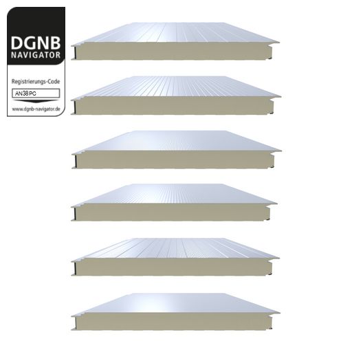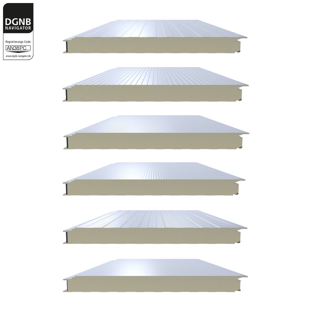 Sandwichelemente FischerTHERM® mit sichtbarer Befestigung sind in den Dicken von 40 bis 120 mm erhältlich.Sandwichelemente FischerTHERM® plus mit verdeckter Befestigung sind in den Dicken von 60 bis 140 mm erhältlich.