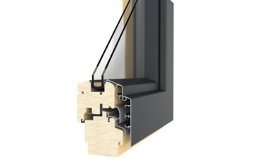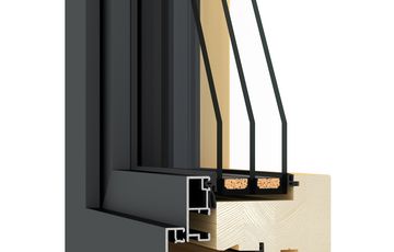 Holzaluminiumfenster 96 mm Bautiefe mit Dreifachverglasung mit Ug 0,7 W/m²K (oder Zweifachglas 1,1 W/m²K) und Uw = 0,91 W/m²K.
