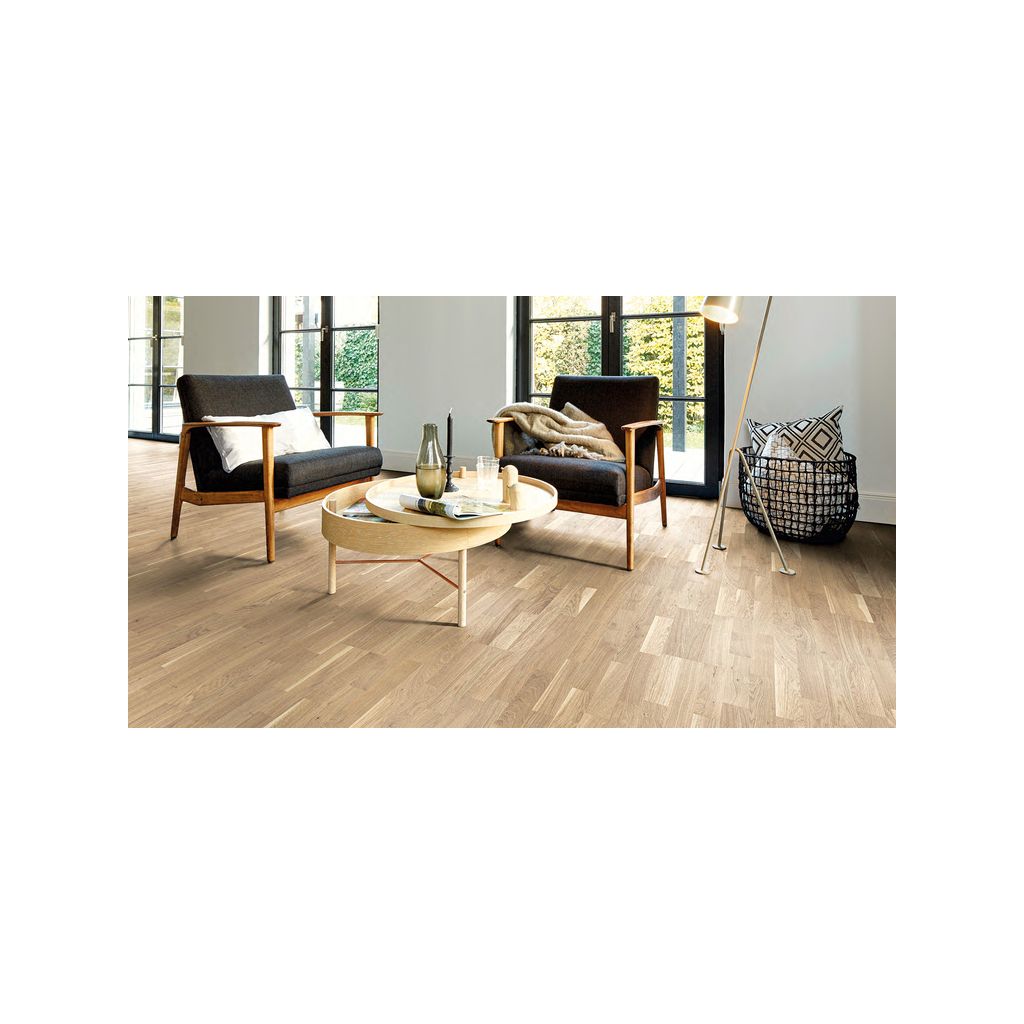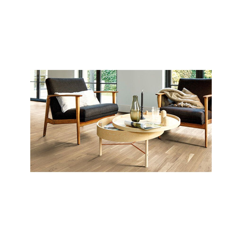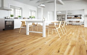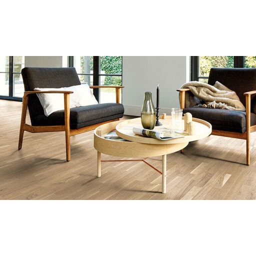 Dreistab Schiffsboden Eiche mit 215 mm Breite für eine harmonische Raumwirkung, besonders recourcenschonend mit 2,7 mm Nutzschicht. Fußbodenheizung gut bis sehr gut geeignet. Brandschutzklasse CFL-S1 und DFL-S1 je nach Oberflächenbehandlung.Kontakt zum Hersteller