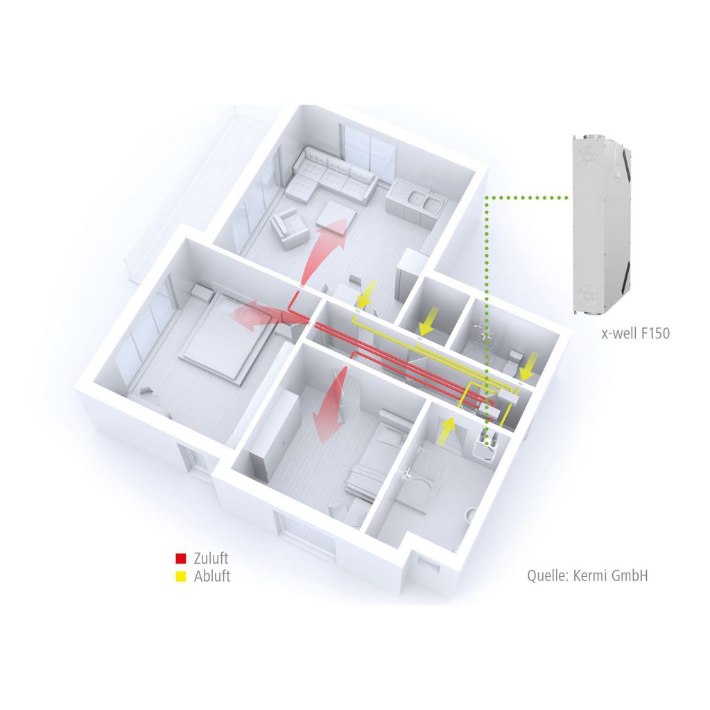 Kermi® x-well® F150 Wohnraumlüftungsgerät mit Wärmerückgewinnung und Kanalanschlüssen.Zur Be- und Entlüftung von Wohnungen und Wohnhäuser bis ca. 105 m² Wohnfläche.