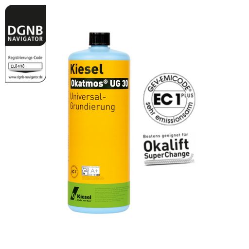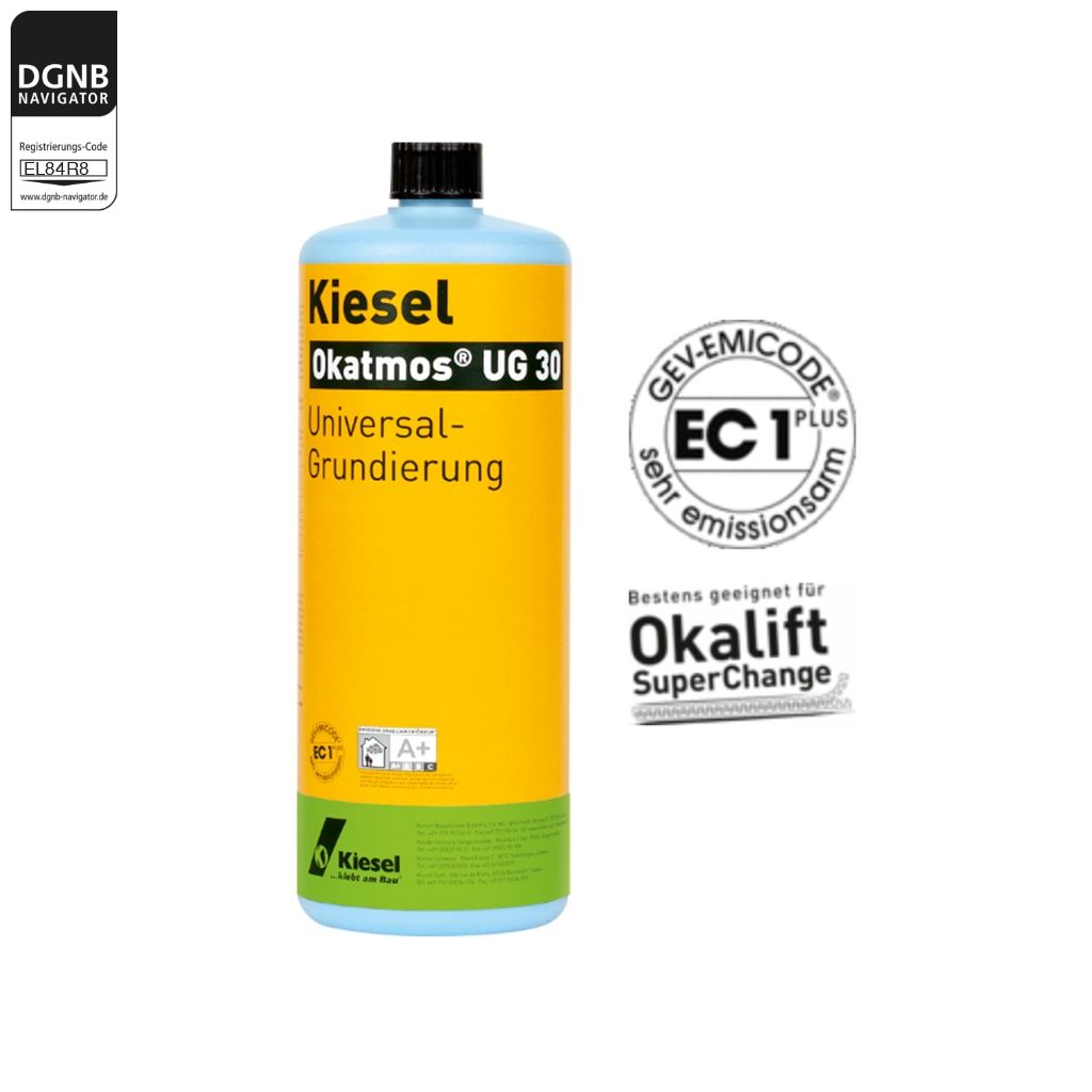 Gebinde vor Gebrauch schütteln. Okatmos® UG 30 auf nicht saugfähigen Untergründen unverdünnt mit Lammfellrolle, Bürste oder Ähnlichem auf den Untergrund auftragen. Auf Estrichen und anderen saugfähigen Untergründen Okatmos® UG 30 in der Verdünnung 1:1 mit Wasser einsetzen. Erst nach vollständiger Trocknung mit Spachtel- oder Verlegearbeiten beginnen.Bezug zum DGNB System