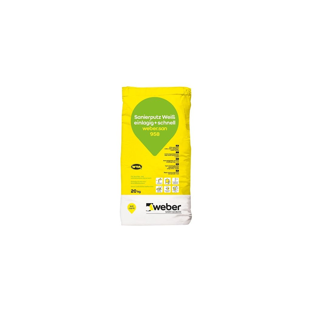 weber.san 958 ist ein einlagiger, schnellabbindender Sanierputz WTA mit hoher Porosität und Wasserdampfdurchlässigkeit, besonders geeignet bei kleinflächigen Instandsetzungsarbeiten, z. B. Innenwandflächen bzw. Arbeiten, die unter Zeitdruck stehen. Das Produkt wird insbesondere auf der Innenseite durchfeuchteter und u. U. salzbelasteter Kelleraußenwände und außen im Sockelbereich aufgehenden Mauerwerks eingesetzt. Es bewirkt eine gute Abtrocknung durchfeuchteten Mauerwerks und die Aufnahme entstehender Salzkristalle. weber.san 958 eignet sich aufgrund der einlagigen Verarbeitung bis 40 mm Schichtdicke besonders bei unebenen Untergründen.Bezug zum DGNB System