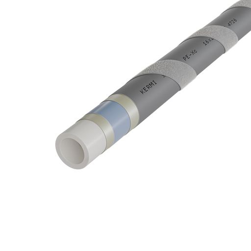 Kermi x-net PE-Xc Klettrohr; Physikalisch vernetztes Polyethylen-Heizrohr ohne chemische Zusätze, hergestellt nach DIN 16892. Geprüft und überwacht nach DIN 4726 und DIN EN ISO 15875 DIN-Certco Registrierung 3V200 MVR (P) /3V375 MVR (P). Sauerstoffdicht nach DIN 4726 In 5-Schicht-Technologie zum Schutz der EVOH-Sauerstoffsperrschicht vor Abrieb im rauen Baustellenbetrieb. PE-Xc-Rohre haben eine sehr hohe Lebensdauer (> 50 Jahre), was den Ressourcenverbrauch durch Ersatz reduziert.
