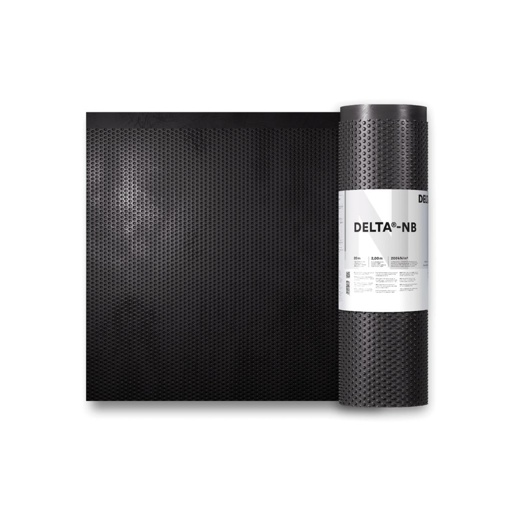 Praxisbewährte druckfeste Noppenbahn aus HDPE mit einer 20 mm hohen Noppenstruktur für den Einsatz als leistungsfähige Sickerschicht in zweischaligen Konstruktionen des Hoch-, Tief- und Ingenieurbaus.