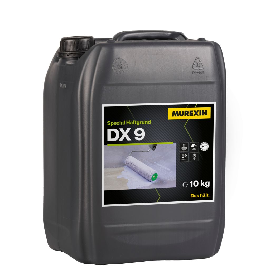 Spezial Haftgrund DX 9 ist ein haftvermittelndes, verdünnbares, lösemittelfreies Grundierkonzentrat auf Spezialdispersionsbasis. Nach Einhaltung der Trocknungszeiten wird eine leicht klebrige Oberfläche erzielt, die sofort überspachtelbar ist. Zur Vorbereitung saugender und nicht saugender Untergründe im Innen- und geschütztem Außenbereich. Als Tiefengrundierung geeignet für saugende, mineralische Untergründe wie Zement-, Anhydrit- und Magnesitestriche (auch bei Fußbodenheizung). Vor der Parkettverklebung mit allen Murexin MSP- und PUR- Klebstoffen die frei von migrationsfähigen Bestandteilen sind (geeignet sind MS-K 539, 1K PU 505 und 2K PU 566). Als Haftbrücke für nachfolgende Fliesenlegearbeiten sowie Spachtelungen bis max. 10 mm (siehe Verarbeitung) mit allen Murexin Nivelliermassen auf Fliesen, Terazzo, fest anhaftenden und wasserbeständigen Klebstoffresten, Epoxidharzanstrichen, Feuchtigkeitssperren auf Epoxidharz- und MSP-Basis (frei von migrationsfähigen Bestandteilen), Holzuntergründen, Metall, sowie gut geschliffenem, gefrästem (Diamanttechnik) oder kugelgestrahltem Gussasphalt. Nicht geeignet auf PUR- Vorstrichen und ungeschliffenen sowie mit Conti-Finish behandelten OSB-Platten.Verwendungshinweise