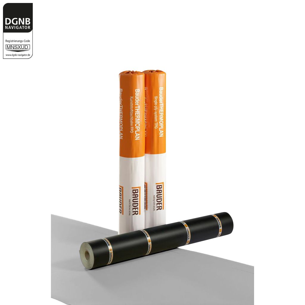 BauderTHERMOPLAN ist eine Dach- und Dichtungsbahn aus thermoplastischem Polyolefin (FPO/TPO), die ressourcenschonend einlagig verlegt werden kann. Nach Ablauf ihrer Nutzungsdauer können BauderTHERMOPLAN Abdichtungsbahnen rückgebaut und stofflich recycelt werden. BauderTHERMOPLAN ist mit einer innenliegenden Trägereinlage aus synthetischen Fasern ausgestattet. Sie ist in folgenden Varianten erhältlich:BauderTHERMOPLAN T (12/15/18/20) - mittige Polyesterverstärkung