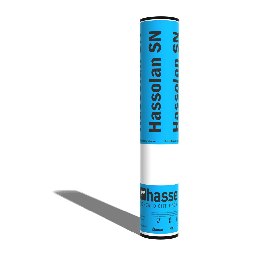 Hassolan SN ist eine selbstklebende Elastomerbitumen-Dampfsperrbahn in Premium-Qualität. Sie ist oberseitig mit einer Spezialbestreuung versehen und im Randbereich mit einer Spezialfolie für die Ausbildung der Sicherheits-Schweißnaht kaschiert. Die Unterseite ist mit einer breiten abziehbaren Schutzfolie ausgestattet und mit einer zusätzlichen Sicherheitsnahtabdeckfolie versehen. Der speziell aus thermisch aktivierbarem, modifiziertem Selbstklebebitumen ausgerüstete Nahtstreifen ermöglicht einen sicheren Verschluss für eine wasserdichte Überdeckung.Hassolan SN entspricht dem Produktdatenblatt für Dampfsperrbahnen des ZVDH. Hassolan SN wird gemäß DIN EN 13970 hergestellt und durch die zertifizierte werkseigene Produktionskontrolle (WPK) nach DIN EN 13707 gütegesichert.