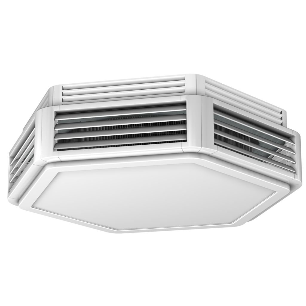 Der Lufterhitzer Ultra ist ein Deckengerät zum Heizen, Kühlen und Lüften in exklusiven Großräumen mit höchstem Design- und Komfortanspruch, wie Handelsketten, Ausstellungs- und Verkaufsräumen, Eingangshallen und Verkaufsstätten. Das Produktprogramm des Ultra umfasst vier Baugrößen. Die Luft wird über den Axial-Ventilator angesaugt und über den ringförmigen Wärmetauscher in den Raum geblasen. Die erwärmte oder gekühlte Luft wird über die voreinstellbaren Lamellen dem Raum bedarfsgerecht zugeführt. Die Ausführungen mit großer Wärmetauscherleistung sind optimal im Niedertemperaturbetrieb einsetzbar.Verwendungshinweise