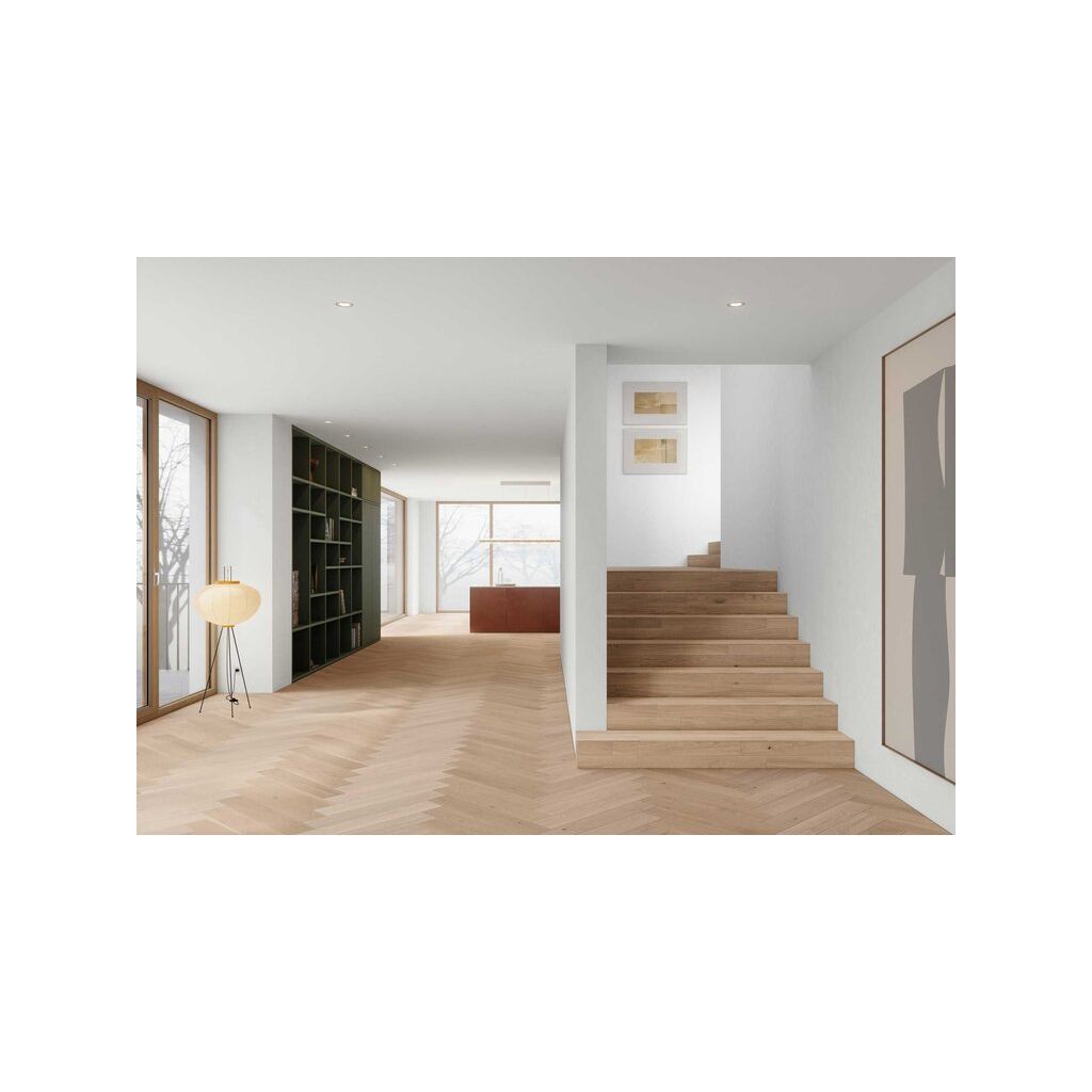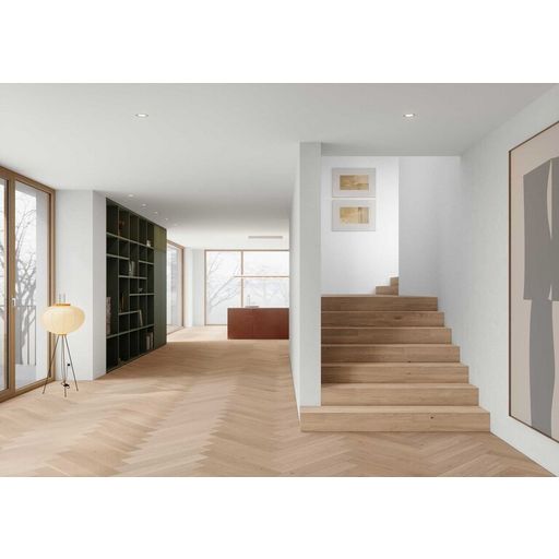 Das 2-Schicht-Format Trendpark 790 in den Massen 790 x 137 mm punktet mit einem breiten Spektrum an Auswahlmöglichkeiten. Die Dielen sind in fünf Farbnuancen, in unterschiedlich stark ausgeprägten Holzmaserungen und mit drei verschiedenen Oberflächenbehandlungen erhältlich. Dank der vierseitig gefasten Diele entsteht ein dreidimensionaler Effekt, der die einzelnen Riemen optisch stärker hervortreten lässt. Die gebürstete Oberfläche unterstreicht die natürliche Struktur des Holzes und verspricht ein besonderes haptisches Erlebnis.2-Schicht-Parkett