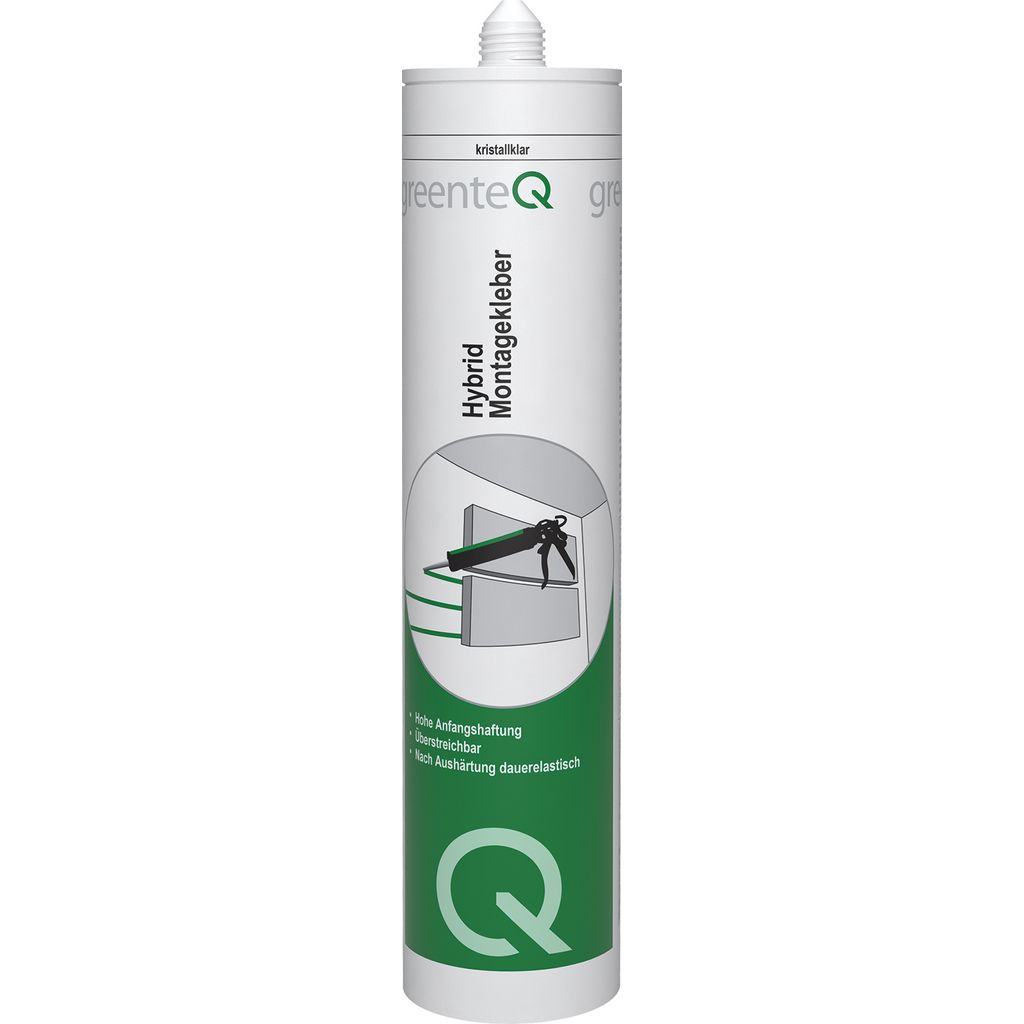Der greenteQ Hybrid Montagekleber kristallklar ist ein qualitativ hochwertiger, dauerhaft elastischer Kleb- und Dichtstoff, der auf der Basis eines MS-Polymers hergestellt wird und sich durch seine kristallklare Beschaffenheit auszeichnet. Dieses Hybridpolymer-Produkt ist für Verklebungen sowohl im Innen- als auch im Außenbereich geeignet und ermöglicht eine transparente und elastische Verbindung in herkömmlichen Bauanwendungen.Besonders vorteilhaft ist der Einsatz dieses Klebers für das unsichtbare Verkleben von Glas und anderen durchsichtigen Materialien im Innenbereich. Er zeichnet sich durch eine hohe Beständigkeit gegen eine Vielzahl von Substanzen aus, darunter (Salz-)Wasser, aliphatische Lösungsmittel, Kohlenwasserstoffe, Ketone, Ester und Alkohole, sowie verdünnte Mineralsäuren und Laugen. Allerdings ist er weniger beständig gegen aromatische Lösungsmittel, konzentrierte Säuren und Chlorkohlenwasserstoffe.