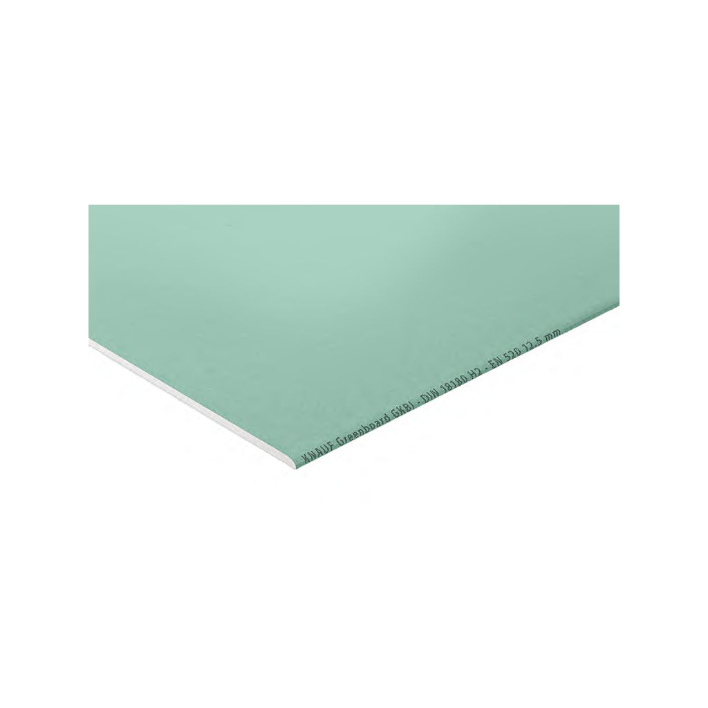 Das Knauf Greenboard ist speziell für den Einsatz in Feuchträumen wie Bäder und Küchen konzipiert. Die Oberflächen sind imprägniert, um die Gipskartonplatte vor Feuchtigkeit zu schützen. Clever: imprägnierte Gipsplatten von Knauf sind immer grün eingefärbt – so kann es nicht zu Verwechslungen auf der Baustelle kommen. Knauf Greenboards wiegen ca. 11,16 kg, so sind sie für eine Person leicht zu transportieren und beim Einbauen gut zu handhaben. Weitere Pluspunkte: Die Platten sind äußerst stabil, nicht brennbar und frei von gesundheitsschädlichen Stoffen.Knauf Bauplatte GKBI ist eine imprägnierte und großformatige Gipskartonplatte, die Sie für viele Trockenbauprojekte in häuslichen Feuchträumen wie Küche oder Bad verwenden können, insbesondere bei großen Flächen. Aufgrund ihrer Imprägnierung ist sie feuchtigkeitsabweisend und daher vor Spritzwasser und erhöhter Luftfeuchtigkeit bestens geschützt. Wie alle imprägnierten Gipsplatten von Knauf ist sie grün eingefärbt – dies verhindert, dass es auf der Baustelle zur Verwechslung kommt. Da die Platte außerdem belastbar und formbeständig ist, werden die Ergebnisse Ihrer Arbeit von Dauer sein.