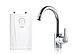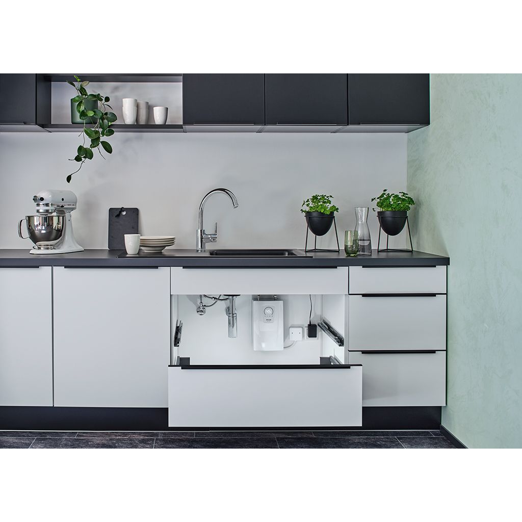 Elektronisch geregelter Untertischdurchlauferhitzer im Set mit der drucklosen Einhebelmischarmatur EAKEinhebel-Spültischmischarmatur mit seitlichem Bedienhebel, Schwenkrohrauslauf 20cm und drei Flexschläuchen ⅜-Zoll