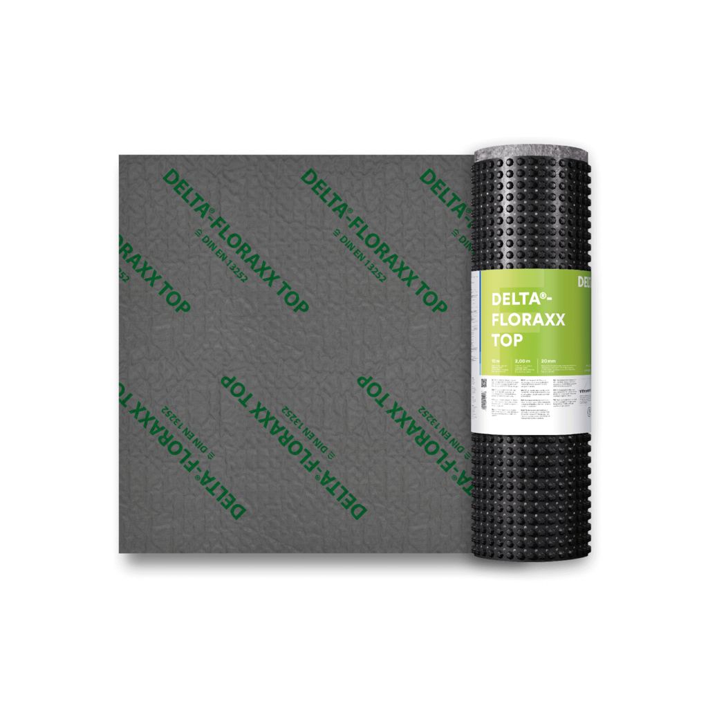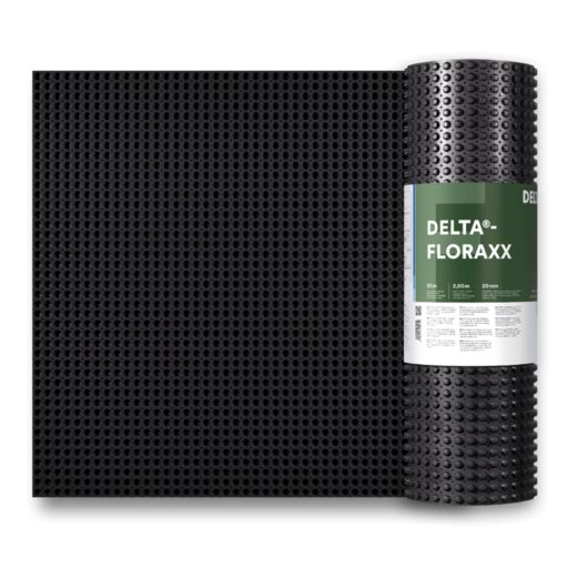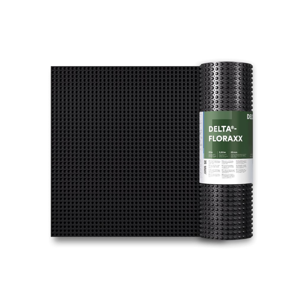 DELTA® - FLORAXX: Diffusionsfähige Schutz- und Dränbahn mit Wasserspeicherfunktion. Flächendränung und Wasserspeicher in einem. Bestens geeignet für die Anwendung auf begrünten Dächern wie auch auf Umkehrdächern geeignet.Die Noppenbahn ist trinkwasserunbedenklich, chemikalienbeständig und unverrottbar im Erdreich.