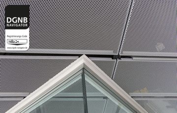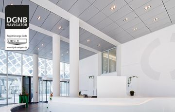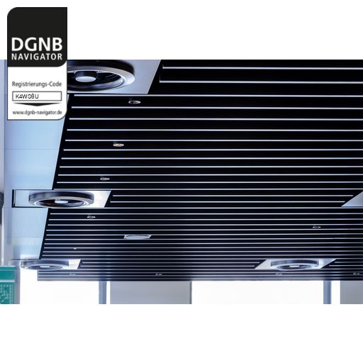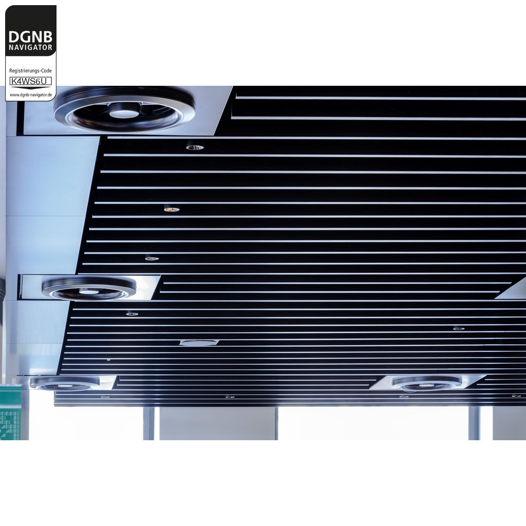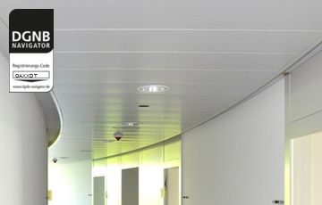 Abgehängte, akustisch wirksame Decke mit Baffeln. Baffeln und Unterkonstruktion bestehen aus verzinktem Stahlblech mit beschichteter Sichtseite und mit oder ohne Akustikvlies/Füllung/thermischer Aktivierung.Bezug zum DGNB System