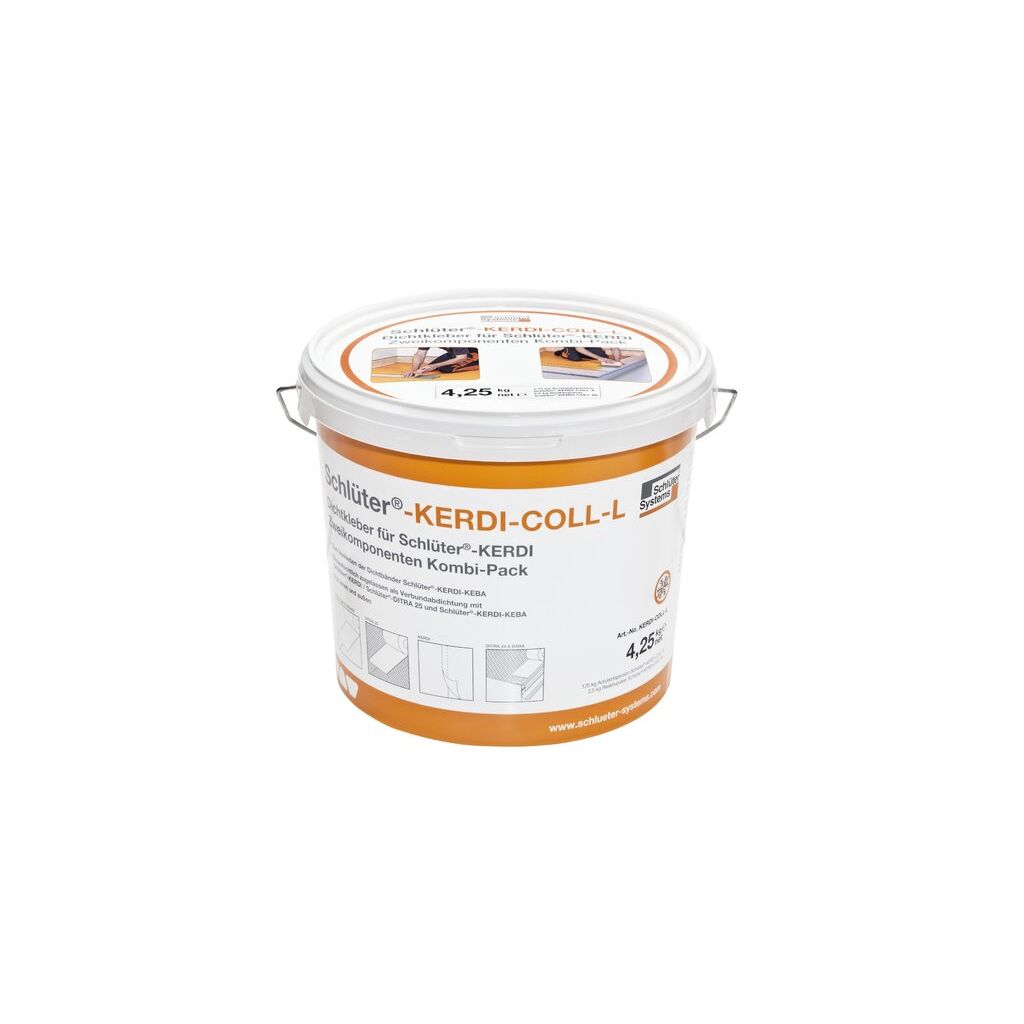 Schlüter-KERDI-COLL-L ist ein zweikomponentiger Dichtkleber auf Basis einer lösemittelfreien Acrylatdispersion und eines zementären Reaktivpulvers.Er eignet sich zum Verkleben und Abdichten der Überlappungen von Schlüter-KERDI Bahnen. Weiterhin können damit dichte Stoß- und Anschlussverklebungen der Abdichtungsbänder Schlüter-KERDI-KEBA auf KERDI, Schlüter-DITRA, Schlüter-DITRA-HEAT und Schlüter-KERDI-BOARD sowie an den Schlüter-BARA Randprofilen erfolgen.