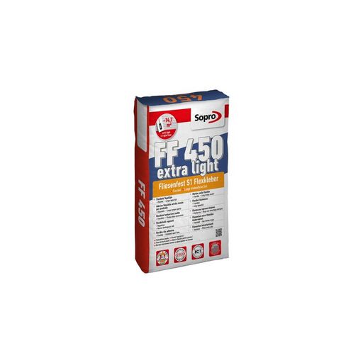 Zementärer, extra leichter Flexkleber, C2 TE S1 nach DIN EN 12004, mit hoher Ergiebigkeit und besten Verarbeitungseigenschaften, zum Ansetzen und Verlegen von keramischen Fliesen und Platten, für Feinsteinzeug, auch im Unterwasserbereich, z. B. in Schwimmbecken und Brauchwasserzisternen. Geeignet auf Wand- und Fußbodenheizungen und Verbundabdichtungen. Mit der 3-in-1 Rezeptur zur Verlegung im Dünnbett und Fließbett sowie zum Spachteln kleinerer Flächen bis maximal 10 mm Schichtstärke.Innen und außen, Wand und Boden