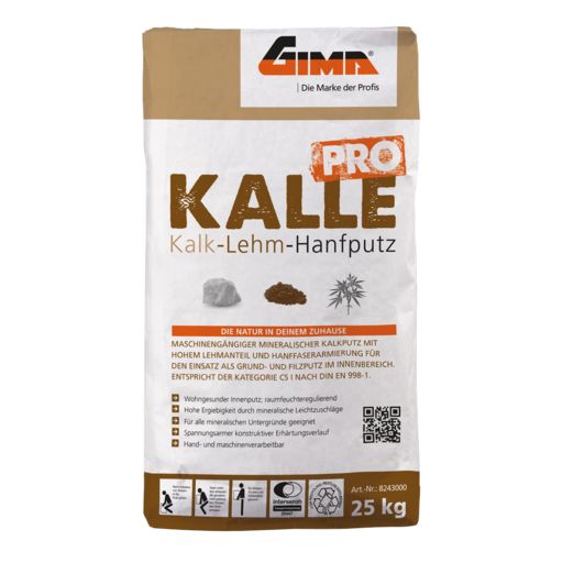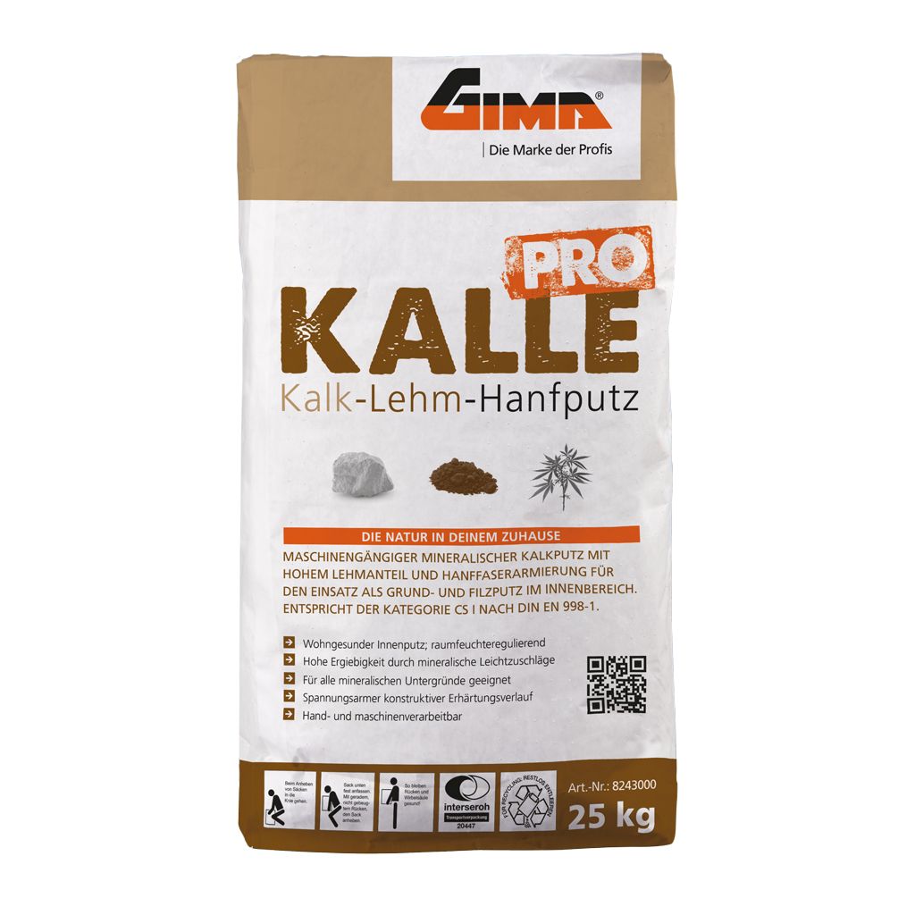 Der GIMA Kalk-Lehm-Hanfputz - KALLE PRO ist ein maschinengängiger mineralischer Kalkputz mit hohem Lehmanteil und Hanffaserarmierung für den Einsatz als Grund- und Filzputz im Innenbereich. Er zeichnet sich durch seinen mineralischen Charakter, sein gutes Standvermögen, eine hohe Alkalität und ein hohes Wasserrückhaltevermögen sowie eine hohe Ergiebigkeit durch mineralische Leichtzuschläge aus. Er entspricht der Kategorie CS I nach DIN EN 998-1. Durch seine natürlichen Bestandteile schafft er die Basis für ein hoch feuchtigkeitsregulierendes und wohngesundes Putzsystem.Verwendungshinweise