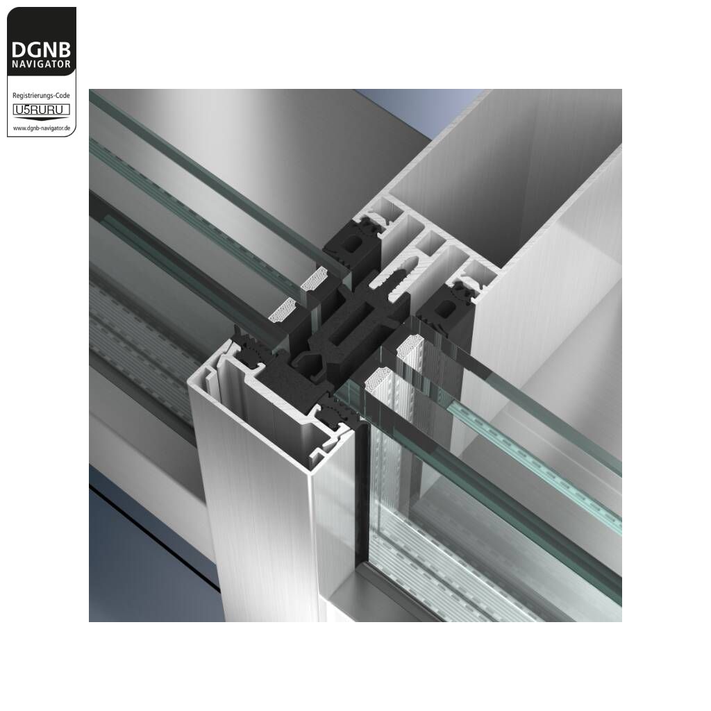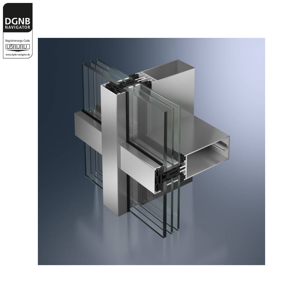 Aluminiumfassadensystem mit 50 mm Ansichtsbreite und optimierter Wärmedämmung. Mit Dreifachverglasung werden Fassaden-Ucw ≤ 0,8 W/(m²K) erreicht. Glasdicken bis 64 mm einsetzbar.Bezug zum DGNB System