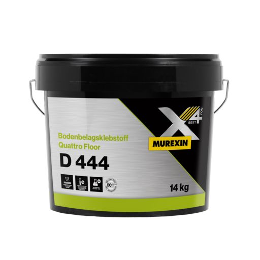 Bodenbelagsklebstoff Quattro Floor D 444 ist ein sehr emissionsarmer, äußerst klebestarker Multifunktionsklebstoff zur Verklebung von elastischen und textilen Bodenbelägen, homogenen und heterogenen PVC-Belägen in Bahnen, PVC-Designbelägen (LVT) im Planken und Fliesenformat, Linoleumbelägen, Kautschukbelägen bis 4mm, Textilbelägen mit allen gängigen Rückenausstattungen, sowie leichten Nadelvliesbelägen auf entsprechend vorbereiteten, saugfähigen Untergründen im Innenbereich. Auch zur Kontaktverklebung geeignet.Auf Fußbodenheizung und für Stuhlrollenbelastung geeignet.