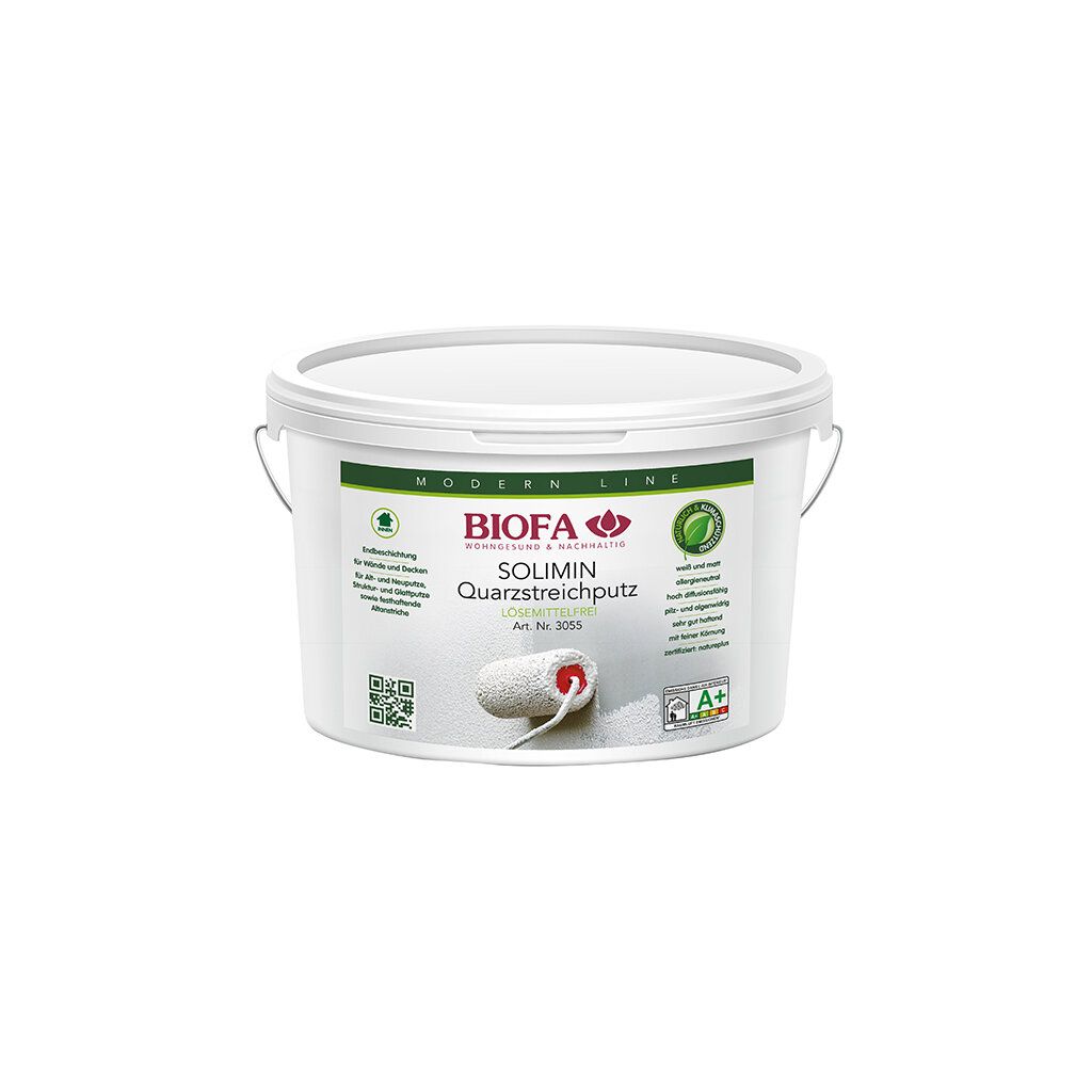 Wand- und Deckenfarbe für alle öffentlichen Einrichtungen und alle Wand- und Deckenflächen in Wohnräumen, Bädern, Küchen,Treppenhäusern und Kellern. Ideal für Feuchträume. Anwendbar auf allen kalk-, zement- und gipshaltigen Putzen, Lehmputzen, Beton, Kalksandstein, Sichtmauerwerk, Raufasertapeten, Glasfasergeweben sowie alten Mineral- und Dispersionsfarben. Kann als Untergrund für BIOFA SOLIMIN Silikatfarbe Art. Nr. 3051 und für BIOFA-Lasurmaltechnik eingesetzt werden.Kontakt zum Hersteller