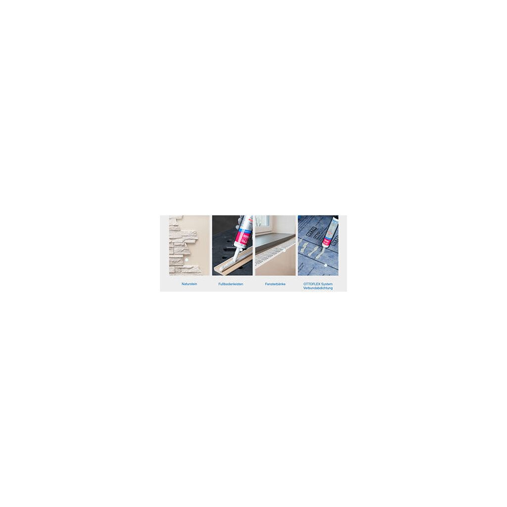 AnwendungsgebieteKleben von Stein, Naturstein und KeramikKleben von lackiertem und emailliertem GlasKlebung von OTTOFLEX® Abdichtbahn / Abdicht- und Entkopplungsbahn im Überlappungsbereich sowie mit Zubehörteilen wie Dichtband, Abdichtungsecken und Dichtmanschetten (nach Anforderungen der ETAG 022 und geprüft nach AbP-Grundsätzen)Kleben von Spiegeln auf Keramik, Glas, Kunststoff, Edelstahl, Aluminium, Holz, Beton etc.Kleben von Fensterbänken, Fußbodenleisten, Zierleisten und TreppenstufenKleben im Karosserie- und Fahrzeugbau, Waggon- und Containerbau, Metall- und Apparatebau, SchiffsbauKleben im lebensmittelnahen BereichKleben und Montieren unterschiedlichster Materialien wie Holz, Holzwerkstoffe, Kunststoffe, Metalle und mineralische UntergründeEigenschaftenExtrem wasserbeständig - Für Klebungen mit hoher WasserbelastungSehr gute Haftung auf vielen Materialien - Ohne Vorbehandlung auf vielen Materialien verwendbarNatursteinverträglich - Verursacht keine Verfettung an NatursteinenHaftet auch auf feuchten UntergründenElastisch - Gleicht Bewegungen ausÜberstreichbar / Überlackierbar - bitte Anwendungshinweise im technischen Datenblatt beachtenSilikonfreiIsocyanatfreiNormen und PrüfungenEntspricht den Anforderungen des Brandverhaltens nach EN 13501: Klasse EUnbedenklichkeitserklärung - geprüft für den Einsatz im lebensmittelnahen Bereich (ISEGA Forschungs- und Untersuchungs-Gesellschaft mbH, Aschaffenburg)EMICODE® EC 1 Plus - sehr emissionsarmFranzösische VOC-Emissionsklasse A+Deklaration in Baubook ÖsterreichGeprüft im Verbund mit OTTOFLEX® Abdichtbahn / Abdicht- und Entkopplungsbahn zur Erteilung eines Allgemeinen bauaufsichtlichen PrüfzeugnissesDokumente