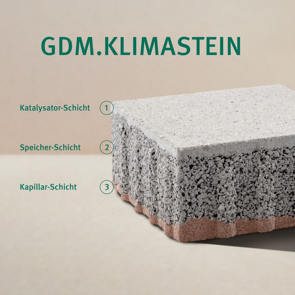 Mit dem GDM.KLIMASTEIN hat GODELMANN den Pflasterstein neu erfunden. Ein Pflasterbelag der Flächen befestigt, ohne sie zu versiegeln, wodurch der Boden als natürliche Ressource zurückgewonnen wird.Als weltweit erster Pflasterstein mit einem dreischichtigen Aufbau erzielt der GDM.KLIMASTEIN eine deutlich höhere Verdunstungsrate als herkömmliche Beläge. Die Vorsatzschicht des GDM.KLIMASTEIN funktioniert als Katalysator-Schicht. Die Sichtfläche reflektiert Wärmeeinstrahlung, reduziert Lärmemissionen und neutralisiert Luftschadstoffe. Die Feuchtigkeit gelangt gefiltert über die Fugen in das Innere des Betonsteins. Der Kernbereich des GDM.KLIMASTEIN dient als Speicher-Schicht: Dank seiner offenporigen Struktur kann er wie ein Schwamm große Mengen Regenwasser aufnehmen und über die Fugen wieder an die Atmosphäre abgeben. Die feinporige dritte, untere Schicht des GDM.KLIMASTEIN ist als Kapillar-Schicht weniger durchlässig, dadurch bleibt das Wasser im Stein und kann nicht in die darunter liegende Bettung versickern. So kann mehr Feuchtigkeit gespeichert und an die Luft abgegeben werden. Gleichzeitig sorgen die Kapillaren dafür, dass der Stein zusätzlich Feuchtigkeit aus dem Oberbau aufnehmen kann.