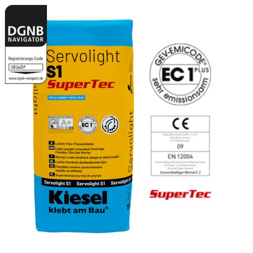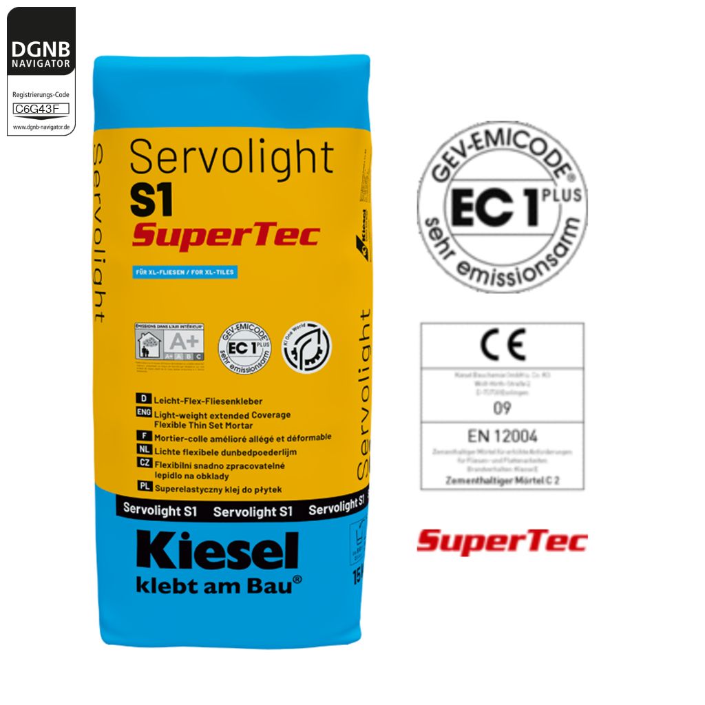 Servolight S1 SuperTec mit sauberem Wasser klumpenfrei anrühren. Nach ca. 5 Minuten Reifezeit nochmals umrühren. Falls erforderlich, Mörtelviskosität durch geringes Verändern der Wasserzugabe einstellen. Zunächst mit der glatten Seite der Kammspachtel eine Kontaktschicht aufziehen. Anschließend mit der entsprechenden Kammspachtel (siehe Tabelle) Servolight S1 SuperTec auf den Untergrund aufziehen und das zu verlegende Material innerhalb der Einlegezeit in das Kleberbett einschieben und andrücken. Je nach Saugfähigkeit des Untergrundes/Belags kann noch innerhalb von ca. 25 Minuten korrigiert werden.Bezug zum DGNB System