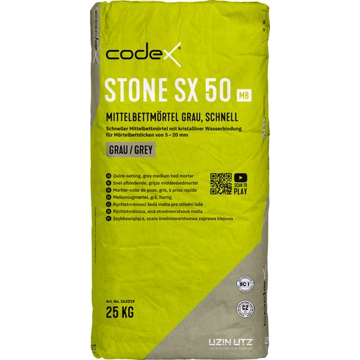 codex Stone SX 50 MB ist ein kunststoffvergüteter, grauer schnellerhärtender Mittelbettmörtel. Durch eine schnelle und kristalline Wasserbindung weist codex Stone SX 50 MB eine frühe Begehbarkeit auf und erhöht die Sicherheit bei der Verlegung von Natursteinen.PRODUKTVORTEILE / EIGENSCHAFTEN: