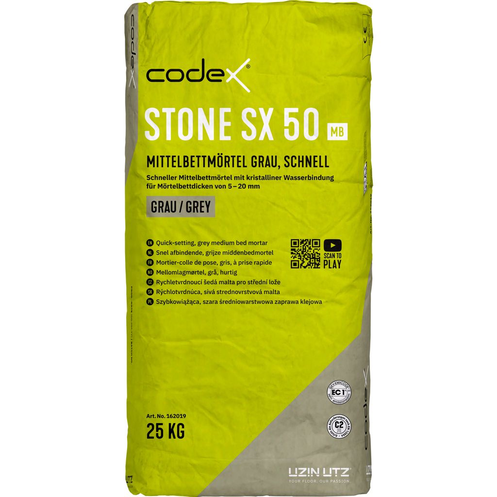 ANWENDUNGSBEREICHE: Der graue Mittelbettmörtel codex Stone SX 50 MB ist für einen breiten Anwendungsbereich konzipiert. Von der normalen Standardverlegung bis hin zu hoch beanspruchten Belägen.Für unterschiedlich dicke Platten (kalibriert/nicht kalibriert),