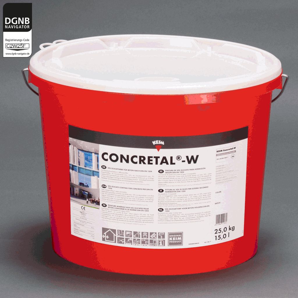 KEIM Concretal-W ist eine Sol-Silikatfarbe nach DIN EN 1062 und erfüllt die Anforderungen an Betonschutzfarben nach DIN EN 1504.