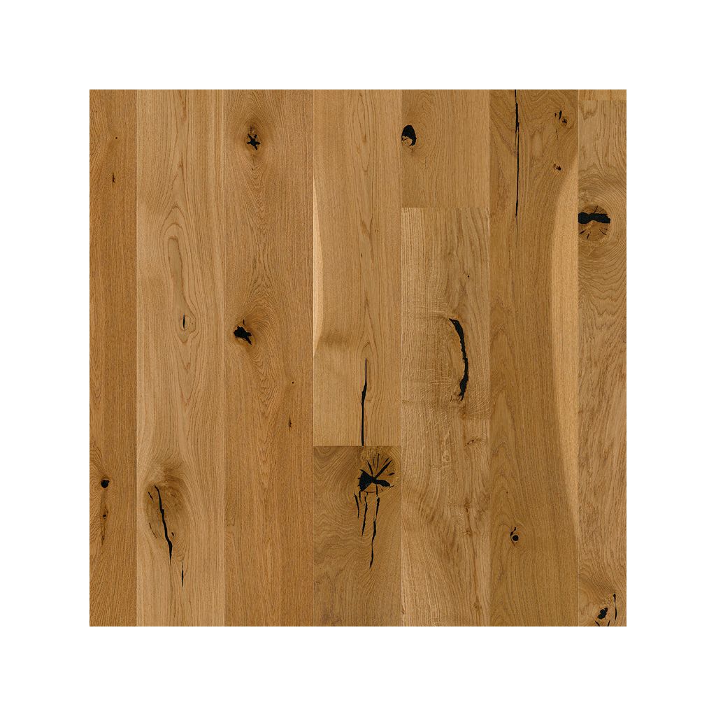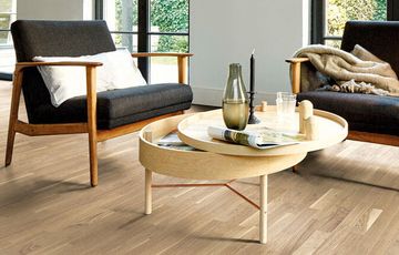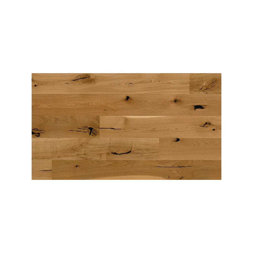 Dreistab Schiffsboden Eiche mit 215 mm Breite für eine harmonische Raumwirkung, besonders recourcenschonend mit 2,7 mm Nutzschicht. Fußbodenheizung gut bis sehr gut geeignet. Brandschutzklasse CFL-S1 und DFL-S1 je nach Oberflächenbehandlung.